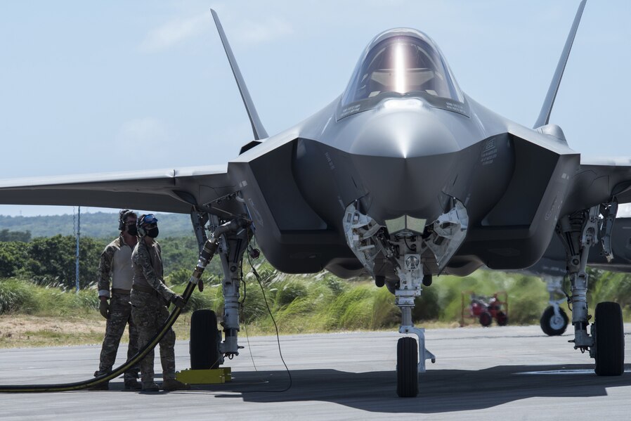 U.S. Air Force Airmen perform hot-pit refueling on an F-35A Lightning II assigned to Eielson Air Force Base, Alaska, at Northwest Field as part of Agile Combat Employment (ACE) multi-capable Airmen training during Cope North 21 at Andersen AFB, Guam, Feb. 16, 2021. ACE is the new warfighting concept that Pacific Air Forces is operationalizing to ensure agility, deterrence, and resiliency in a contested or degraded environment. The F-35A made its debut on this year’s iteration of Cope North.