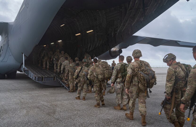 U.S. Soldiers with the 82nd Airborne Division board a C-17 Globemaster III to undergo sustained airborne training prior to a static-line jump during Exercise Garuda Shield 21 at Andersen Air Force Base, Guam, Aug. 3, 2021. Garuda Shield 21 is a U.S. Army Pacific-sponsored exercise, which involved approximately 1,000 U.S. and 850 Indonesian Army Soldiers, that enhanced combined interoperability capabilities through training and cultural exchange. This exercise continued to solidify the U.S.-Indonesia Major Defense Partnership and advanced cooperation in support of a free and open Indo-Pacific Region.