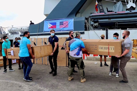 U.S. military personnel with Indo-Pacific Command’s Civil Military Support Element–Philippines deliver ICU beds and COVID-19 vaccine cold storage units to staff from the Palawan provincial government in coordination with the Philippine Coast Guard.