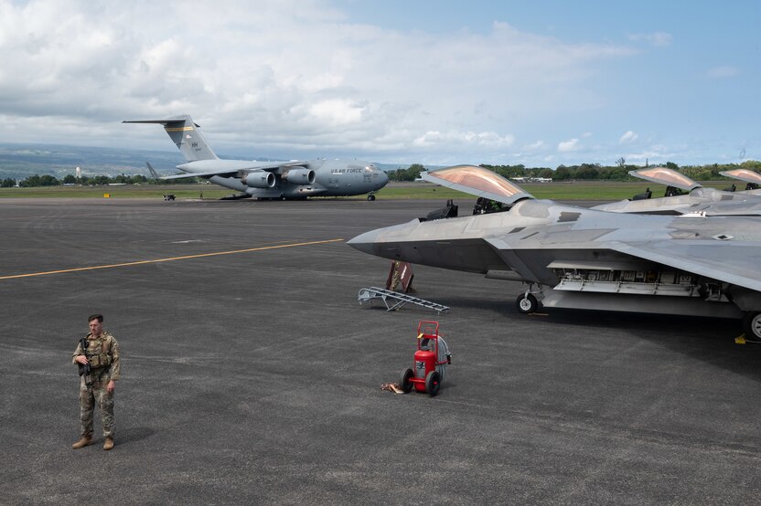 Tech. Sgt. Eric Lesperance, 154th Security Forces Squadron defender, provides a security detail for F-22 Raptor and C-17 Globemaster III aircraft during exercise Ho`oikaika March 4, 2022, at Hilo International Airport, Hawaii. The first iteration of Ho`oikaika took place in three separate locations over three days. It encompassed the full spectrum of mission-support and operational capabilities, including the mobile application of logistical supplies, civil engineering, communication networks, security details, aircraft maintenance and mission-ready aircraft.