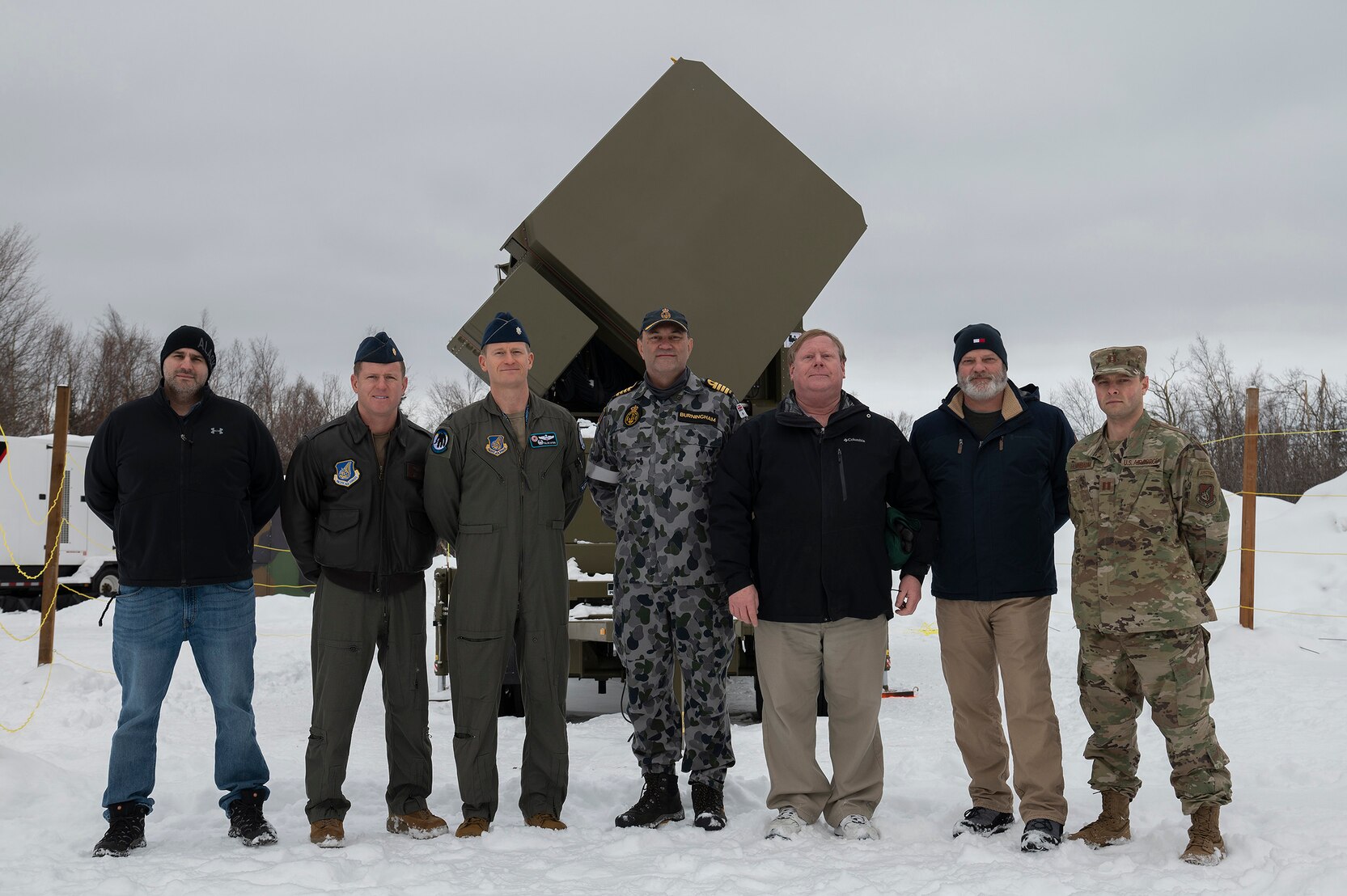 U.S. Airmen assigned to the 354th Range Squadron and representatives from the Royal Australian Navy pose in front of the Joint Pacific Alaska Range Complex’s first advanced emitter near Eielson Air Force Base, Alaska, March 1, 2022. The state-of-the-art emitter, nicknamed “YETI,” replicates signals emitted by enemy surface-to-air-missile radars, training pilots and aircrews to detect and destroy them.