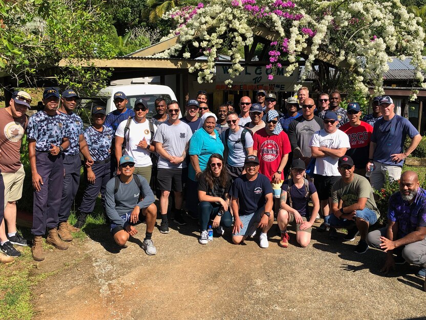 Volunteers from U.S. Coast Guard Cutter Munro prepare to volunteer alongside Fiji Navy members at the Father Law Home, an elder care facility in the Port of Suva, Fiji, April 22, 2022. Volunteers spent the day cleaning and gardening and finished with a resident visit that included singing by both U.S. Coast Guard and Fiji Navy members.