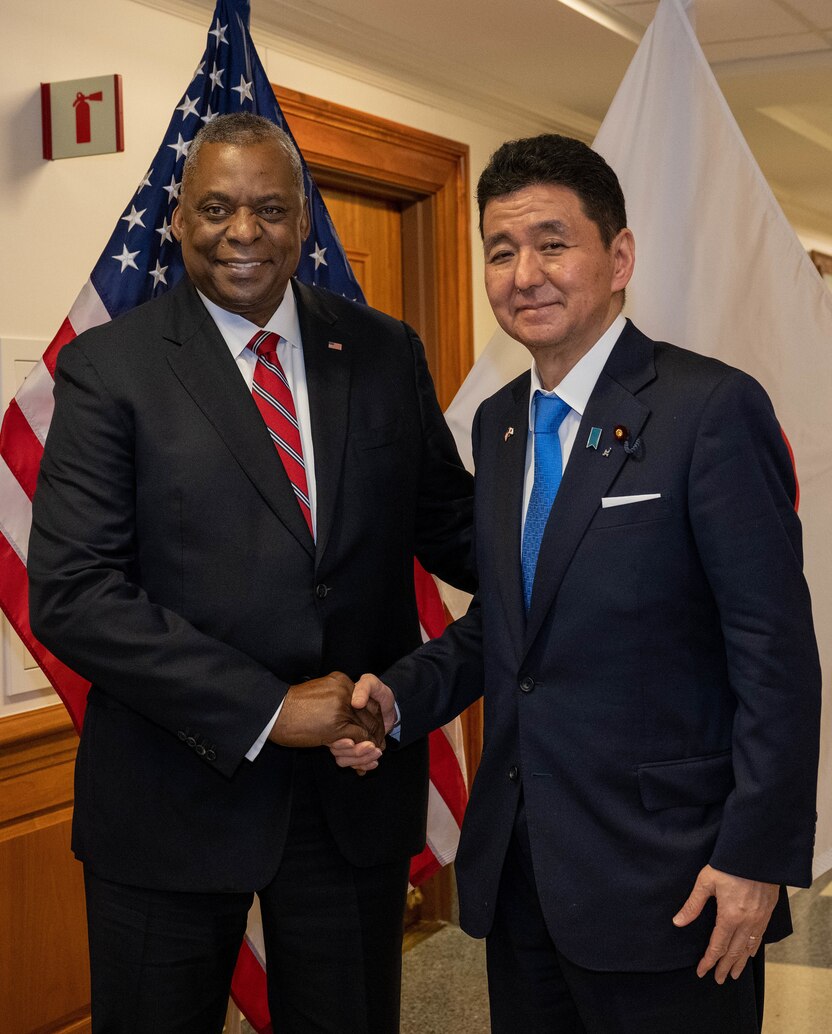 Secretary of Defense Lloyd J. Austin III stands with Japanese Defense Minister Nobuo Kishi prior to a bilateral meeting at the Pentagon, Washington, D.C., May 4, 2022.