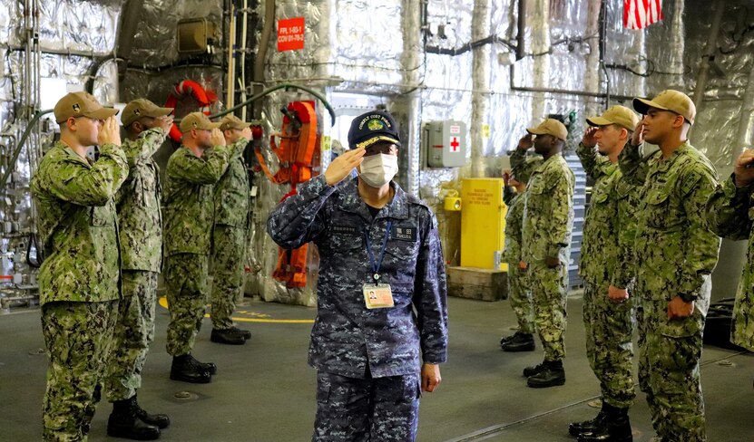 Japan Maritime Self-Defense Force Vice Adm. FUKUDA Tatsuya, commander, Fleet Escort Force, arrives aboard the Independence-class littoral combat ship USS Charleston (LCS 18). Charleston, part of Destroyer Squadron (DESRON) 7, is on a rotational deployment, operating in the U.S. 7th Fleet area of operations to enhance interoperability with partners and serve as a ready-response force in support of a free and open Indo-Pacific region.