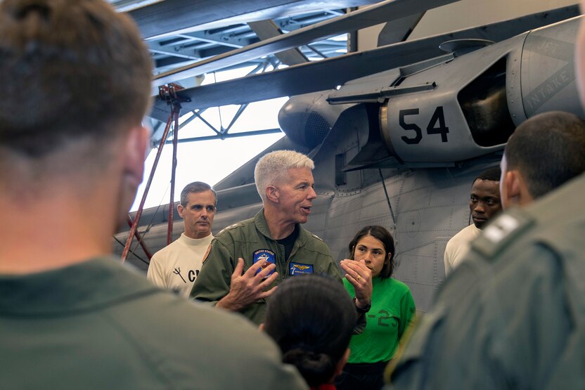 Vice Adm. Karl Thomas, Commander, U.S. 7th Fleet, center, speaks with Sailors assigned to Helicopter Sea Combat Squadron (HSC) 23 in the hangar bay aboard amphibious assault carrier USS Tripoli (LHA 7), June 16, 2022. Tripoli is operating in the U.S. 7th Fleet area of operations to enhance interoperability with allies and partners and serve as a ready response force to defend peace and maintain stability in the Indo-Pacific region.