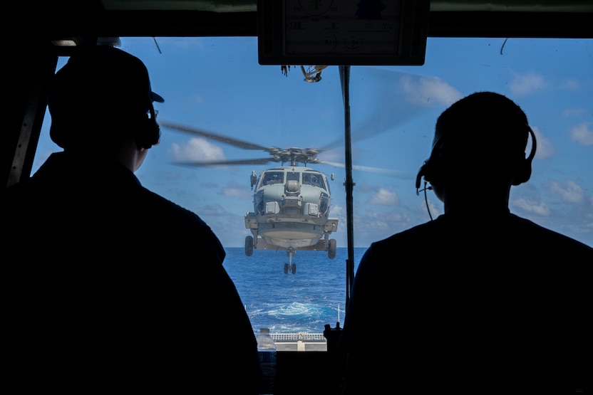 U.S Coast Guard Legend-class cutter USCGC Midgett (WMSL 757) crewmembers provide take-off instructions to a U.S. Navy MH-60R Seahawk helicopter crew during flight operations during Rim of the Pacific (RIMPAC) 2022. Twenty-six nations, 38 ships, three submarines, more than 170 aircraft and 25,000 personnel are participating in RIMPAC from June 29 to Aug. 4 in and around the Hawaiian Islands and Southern California. The worlds largest international maritime exercise, RIMPAC provides a unique training opportunity while fostering and sustaining cooperative relationships among participants critical to ensuring the safety of sea lanes and security on the world’s oceans. RIMPAC 2022 is the 28th exercise in the series that began in 1971.