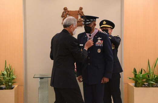Dr. Ng Eng Hen, Singapore Minister for Defence, presents Air Force Chief of Staff Gen. CQ Brown, Jr. with the Meritorious Service Medal during a visit to Singapore Aug. 7-10. The purpose of the visit was to reaffirm the U.S. Air Force's commitment to the bilateral defense relationship and discuss efforts to enhance cooperation.
