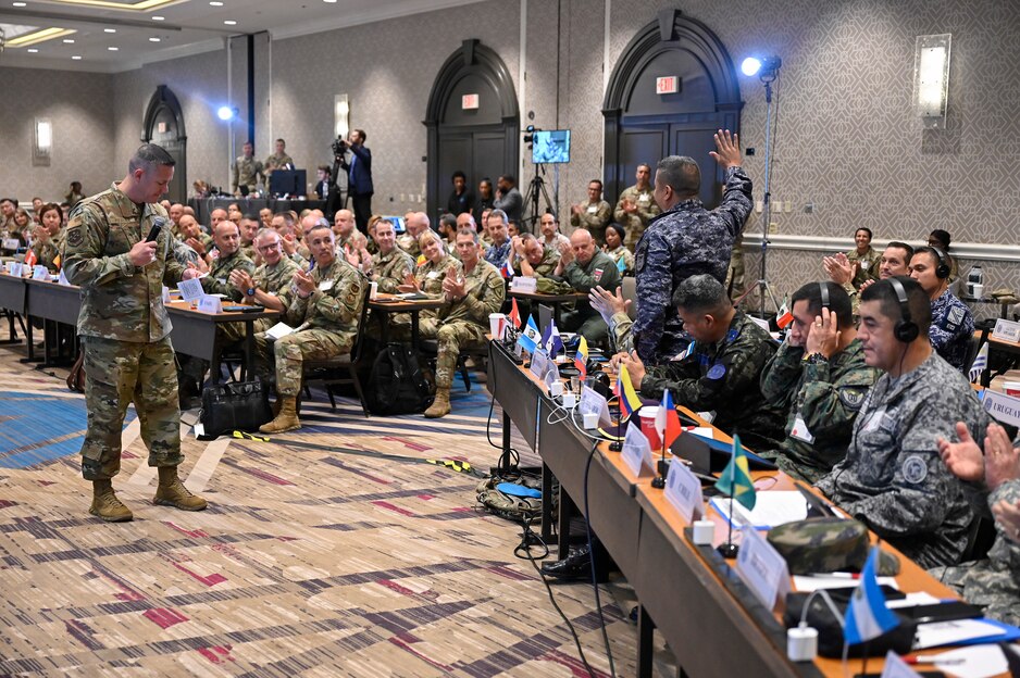 Attendees introduce themselves during the Senior Enlisted Leader International Summit in Arlington, Va., Aug. 1, 2022. The summit is hosting senior enlisted leaders from 54 countries to reinforce partnerships between military services.