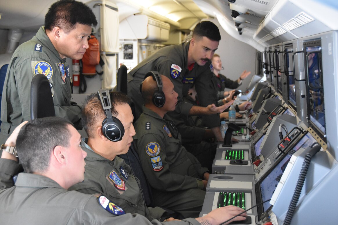 Naval Aircrewman (operator) 2nd Class William Pottenger (top) and Naval Aircrewman (operator) 3rd Class Justin Fruci, both assigned to the “Red Lancers” of Patrol Squadron (VP) 10, explain mission work stations during a tour of a P-8A Poseidon as part of a weeklong engagement promoting joint regional security and partnerships out of Mactan, Philippines. VP-10 is based in Jacksonville, Florida and is currently operating from Kadena Air Base in Okinawa, Japan. It conducts maritime patrol and reconnaissance, as well as theater outreach operations, as part of a rotational deployment to the U.S. 7th Fleet area of operations.