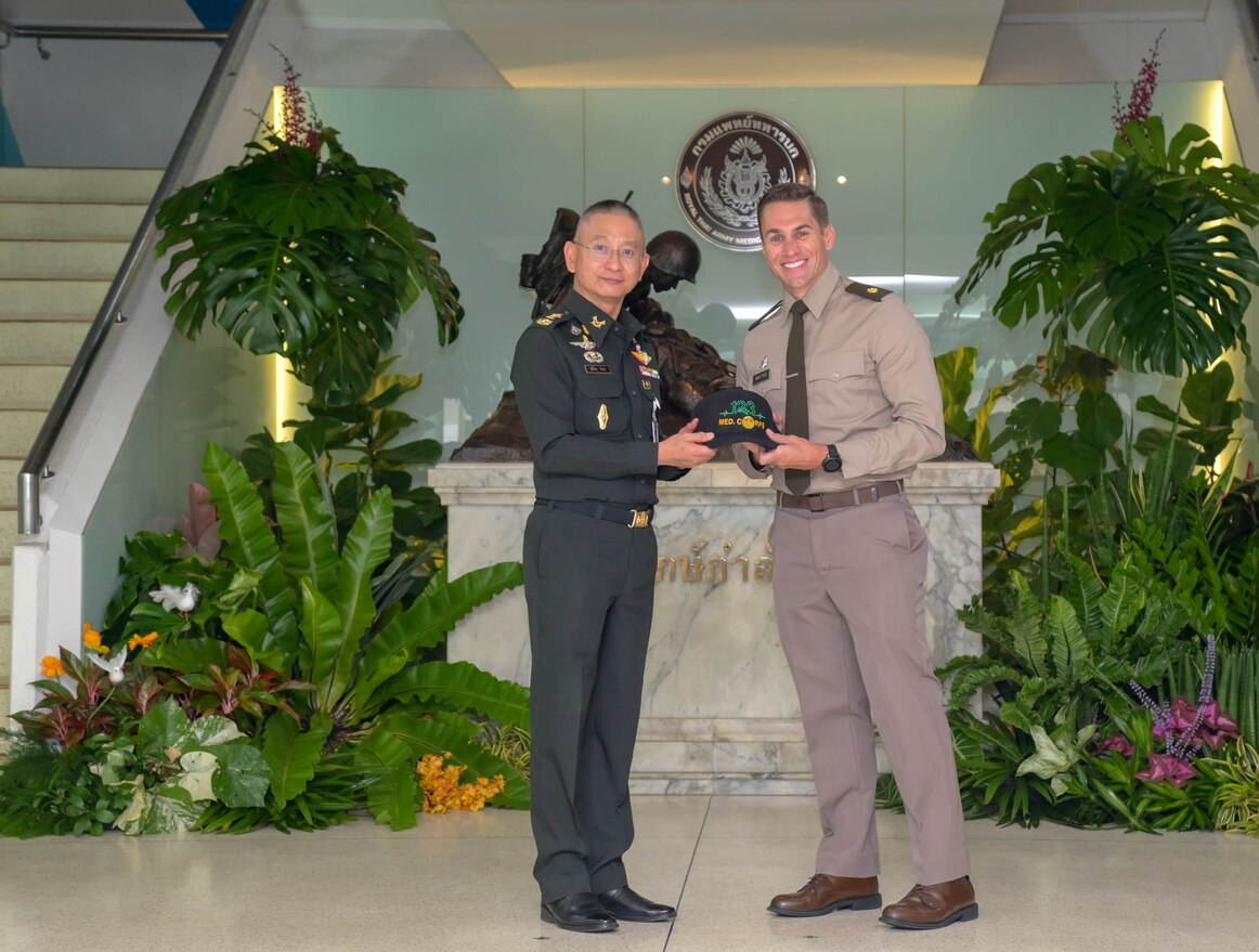Maj. Taylor Whitten, Armed Forces Research Institute of Medical Sciences, executive officer and Royal Thai Army Surgeon General Wuticha Isara hold a hat with the letters 123 inscribed on it to celebrate the RTA Medical Department's 123rd Anniversary Ceremony, Jan. 9. The celebration brought together 225 attendees and professionals in military medicine from around the local region representing RTA, RTAMED, Royal Thai Navy, Royal Thai Police, private industry, government, and academia. Representatives from AFRIMS were invited to join the ceremony as the only foreign military presence. (Courtesy photo)