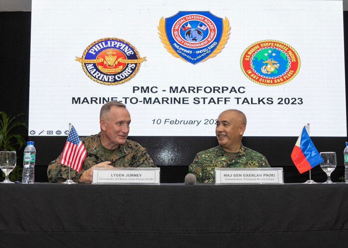 U.S. Marine Corps Lt. Gen. William M. Jurney, left, commander, U.S. Marine Corps Forces, Pacific (MARFORPAC), speaks with Philippine Marine Corps Maj. Gen. Charlton Sean M. Gaerlan, commandant, Philippine Marine Corps (PMC), during the PMC-MARFORPAC Staff Talks, at the Citystate Asturias Hotel in Puerto Princesa, Palawan, Philippines, Feb. 10, 2023. The PMC-MARFORPAC Staff Talks serve to strengthen the relationship between MARFORPAC and the Philippine Marine Corps by providing the opportunity to align goals and objectives and collaborate on common interests through bilateral discussions and engagements. (U.S. Marine Corps photo by Sgt. Danny Nateras)