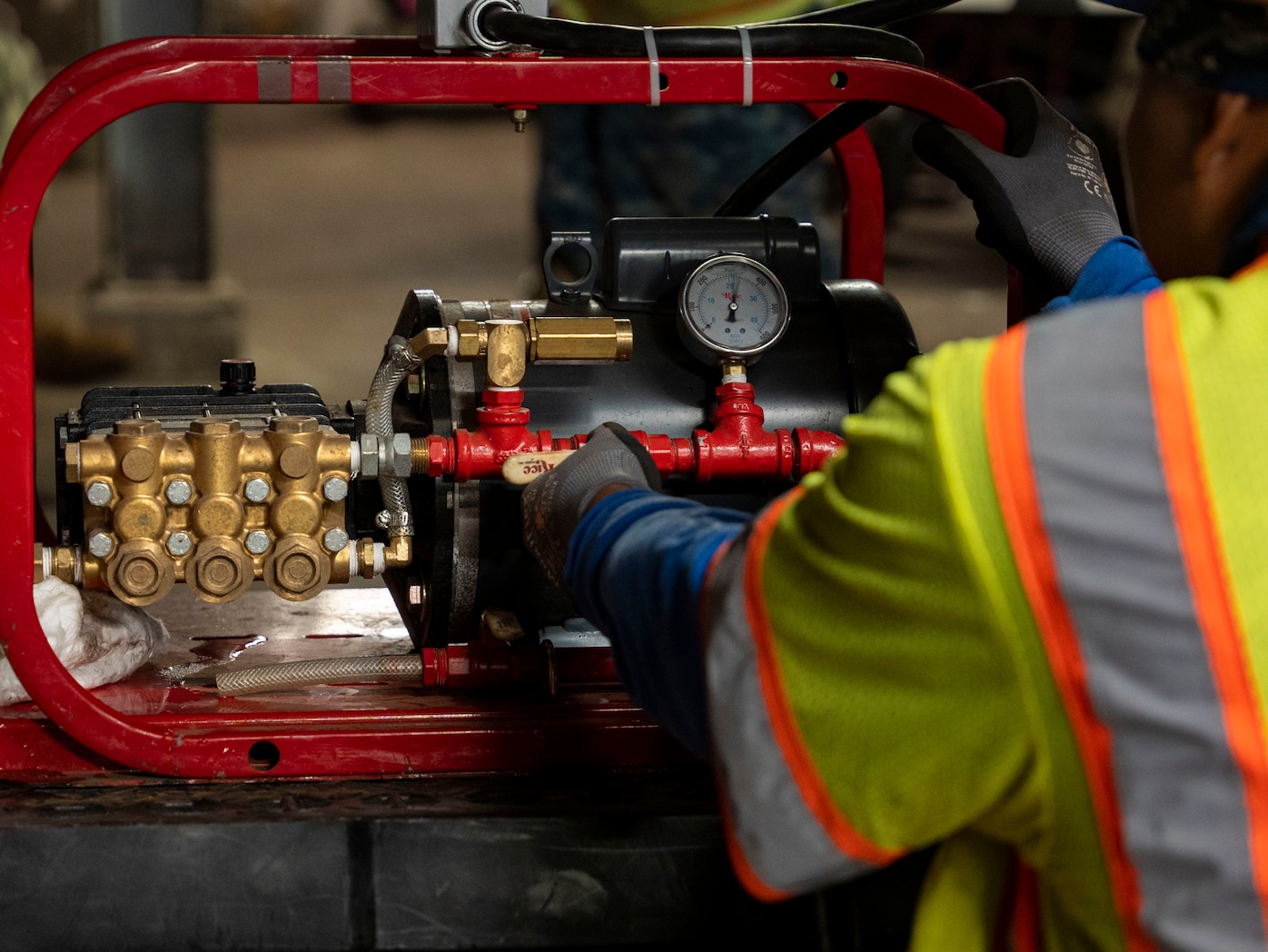 A Red Hill Bulk Fuel Storage Facility (RHBFSF) contractor uses a hydrostatic tester at Halawa, Hawaii, March 14, 2023. Hydrostatic testing is an effective method for examining the safety and durability of pipes and pressure vessels. Joint Task Force-Red Hill is in phase three of its five-phase defueling plan, as contractors and Navy technical experts complete repairs to ensure a safe and expeditious defueling of the RHBFSF. (U.S. Navy photo by Petty Officer 3rd Class James Finney)