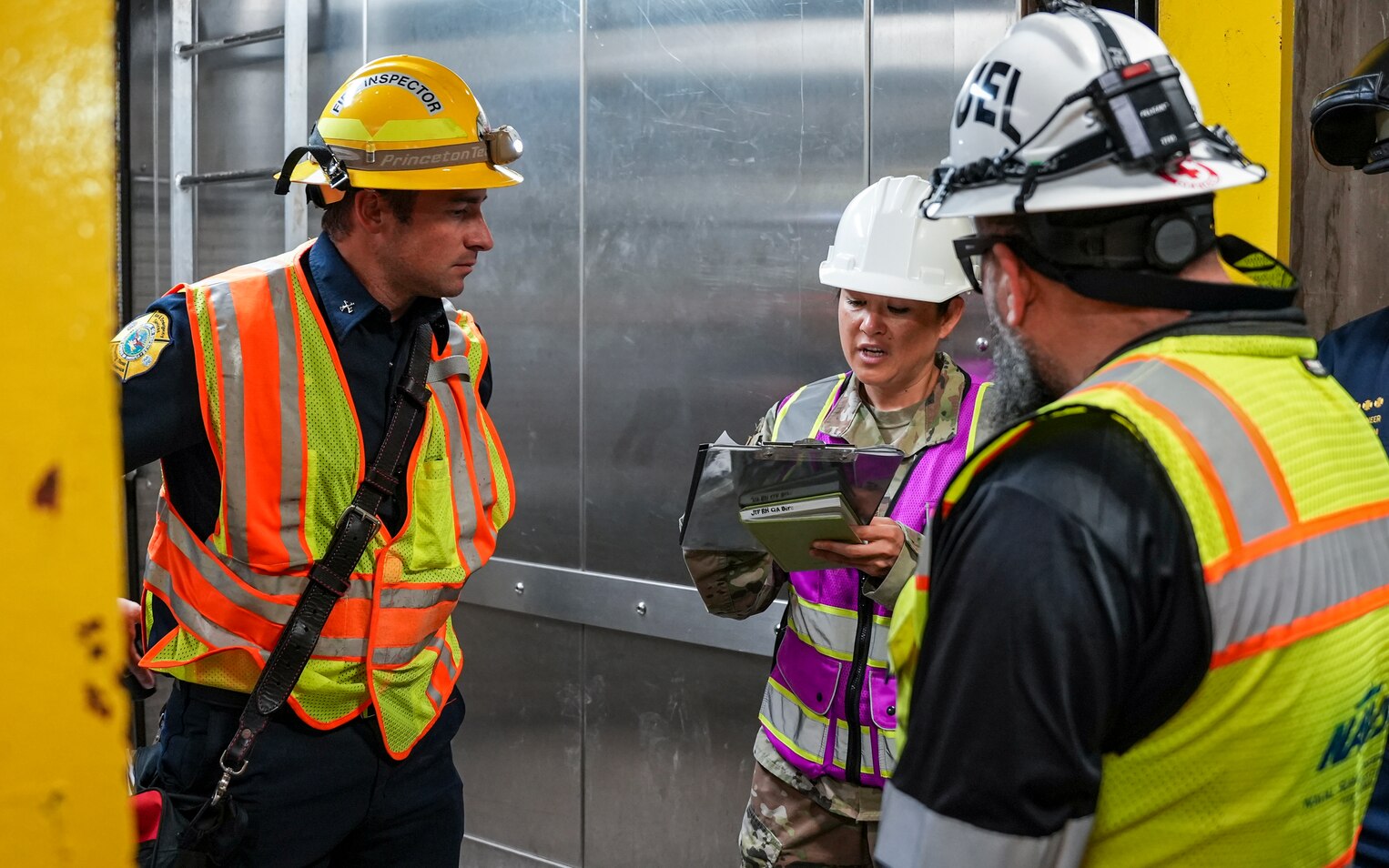 Joint Task Force-Red Hill (JTF-RH) Occupational Health and Safety Representative, U.S. Air Force Master Sgt. Karen O’Neal, talks with safety professionals from Naval Supply System Command and Joint Base Pearl Harbor-Hickam during a quality assurance walkthrough at the Red Hill Bulk Fuel Storage Facility (RHBFSF) in Halawa, Hawaii, April 11, 2023. JTF-RH is in phase three of its five-phase defueling plan. Personnel are focused on completing repairs, quality control tasks, training, response preparation, the National Environmental Policy Act Environmental Assessment, regulatory approvals and operational planning for such things as dewatering, repacking, and defueling. This extensive preparatory work will help ensure the safe and expeditious defueling of the RHBFSF. (U.S. Navy photo by Mass Communication Specialist 2nd Class James Finney)