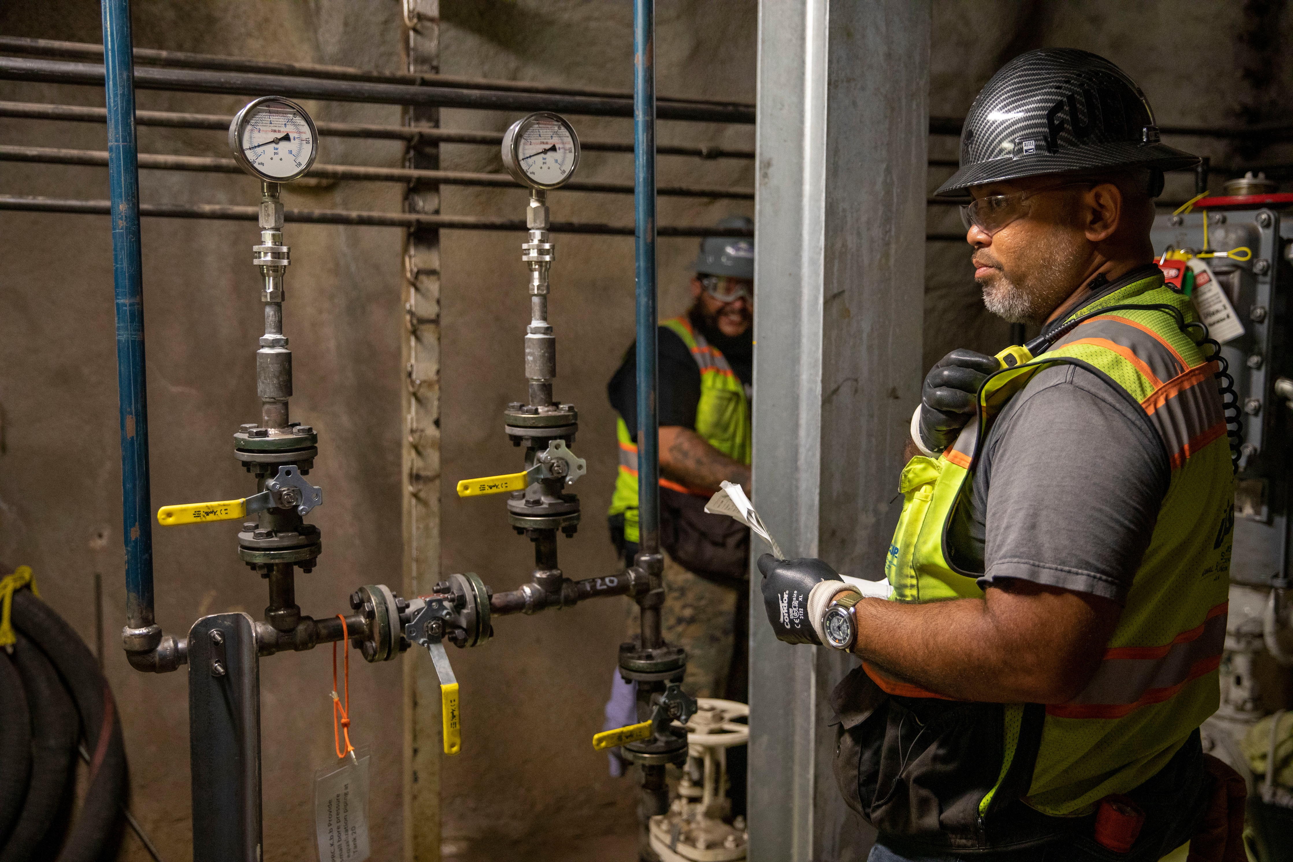 A fuel works leader with Joint Task Force-Red Hill (JTF-RH) facilitates dewatering operations at the Red Hill Bulk Fuel Storage Facility (RHBFSF) in Halawa, Hawaii, April 17, 2022. Dewatering is a critical step prior to defueling the RHBFSF. Dewatering removes the water from the fuel storage tanks. This is a routine task for maintenance of underground fuel storage tanks and is essential to prevent corrosion and protect fuel quality. Fuel tanks must have air vents to maintain safe tank operation. Regulators from the Hawaii Department of Health and the Environmental Protection Agency are on site during dewatering. JTF-RH is committed to working with regulators, government officials, and stakeholders to ensure Red Hill is defueled safely, expeditiously and in compliance with all applicable laws and regulations. (U.S. Army photo by Spc. Matthew Mackintosh)