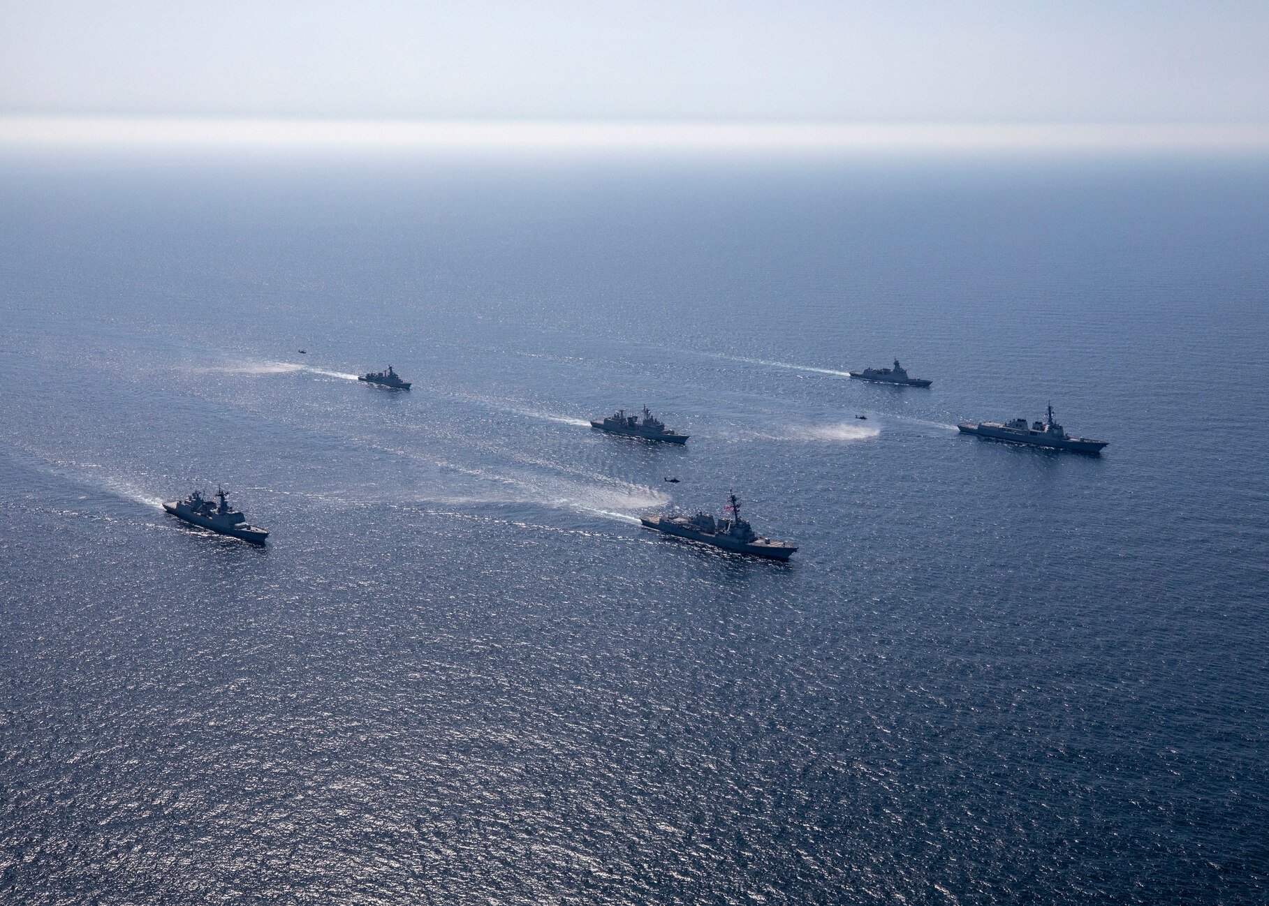 230427-N-CD453-1098 YELLOW SEA (April 27, 2023) U.S. Army AH-64D/E Apache helicopters attached to the 5th Squadron, 17th Cavalry Regiment, 2nd Combat Aviation Brigade, fly alongside Arleigh Burke-class guided-missile destroyer USS John Finn (DDG 113) as the ship sails in formation with Republic of Korea Navy ships Sejong the Great-class guided-missile destroyer ROKS Sejong the Great (DDG 991), Daegu-class frigate ROKS Seoul (FFG-821), Gwangaetto the Great-class multipurpose destroyer ROKS Eulji Mundeok (DDH-972), Chungmugong Yi Sun-sin-class multipurpose destroyer ROKS Choe Yeong (DDH 981), and Ulsan-class frigate ROKS Cheongju, during Maritime Counter Special Operations Exercise (MCSOFEX) in the Yellow Sea, April 27. John Finn is assigned to Commander, Task Force 71/Destroyer Squadron (DESRON) 15, the Navy’s largest forward-deployed DESRON and U.S. 7th Fleet’s principal surface force.