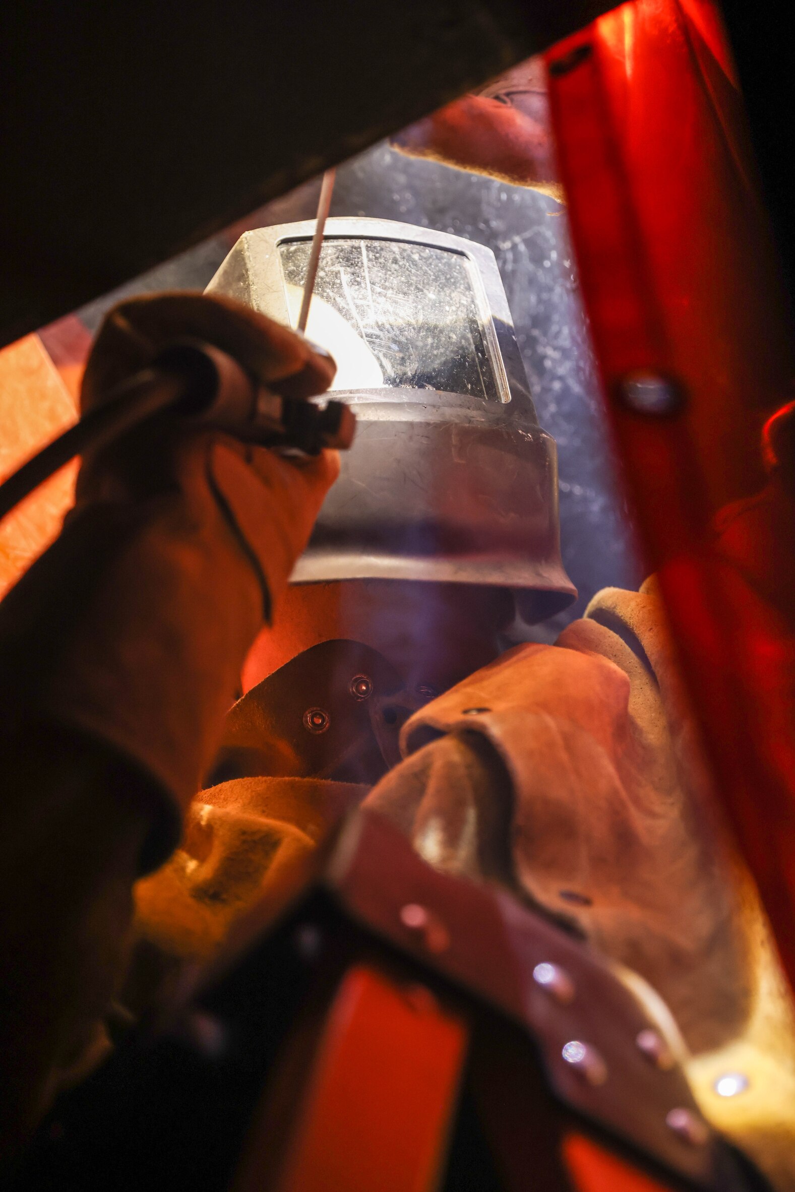 A Joint Task Force-Red Hill (JTF-RH) contractor welds a support beam during repairs in Halawa, Hawaii, April 25, 2023. JTF-RH is in phase three of its five-phase defueling plan. Personnel are focused on completing repairs, quality control tasks, training, response preparation, the National Environmental Policy Act Environmental Assessment, regulatory approvals and operational planning for all major milestones. This extensive preparatory work will help ensure the safe and expeditious defueling of the Red Hill Bulk Fuel Storage Facility. (DoD photo by U.S. Army Sgt. Kyler L. Chatman)