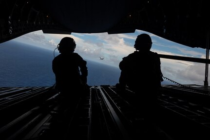 Royal Australian Air Force Corporal Charlotte Roe, a C-17 Globemaster III Loadmaster assigned to No. 36 Squadron RAAF in Base Amberley, Australia, left, and U.S. Air Force Master Sgt Jason Livingston, a C-17 Loadmaster assigned to 16 Airlift Squadron in Joint Base Charleston, SC, right, watch as a U.S. C-17 from the 62nd Airlift Wing in Joint Base Lewis-McChord, Washington, flies behind a RAAF C-17 from No. 36 SQN over the Commonwealth of the Northern Mariana Islands during exercise Mobility Guardian 23, July 12, 2023. MG23 is an opportunity to train alongside our Allies and partners to demonstrate interoperability and bolster our collective ability to support a free and open Indo-Pacific. (U.S. Air Force photo by Tech. Sgt. Sean Carnes)