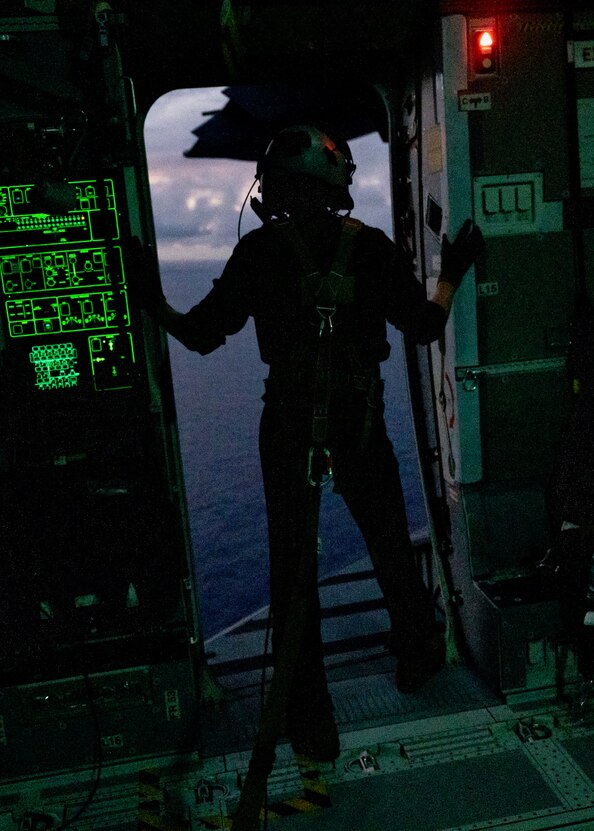A French Air and Space Force A400M Loadmaster assigned to the 1/61 “Touraine” Transportation Squadron scans the ocean with NVG looking for a lost ship during a search and rescue operation in the Pacific Ocean, July 10, 2023. This was a joint operation between the French, Canadian, and U.S. military forces.