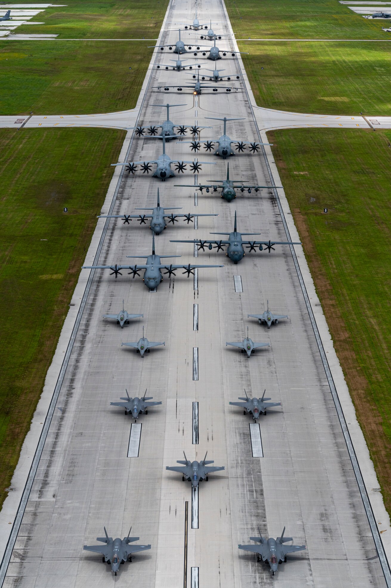 U.S. and coalition aircraft deployed to the Indo-pacific theater conduct an elephant walk on Andersen Air Force Base, Guam, July 19, 2023. More than 15,000 U.S. and coalition forces are participating in various exercises across the INDOPACOM area of responsibility to enhance readiness and interoperability. (U.S. Air Force photo by Staff Sgt. Christian Sullivan)