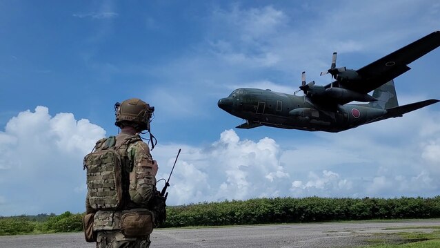 U.S. Air Force Maj. Michael Bakke from the 621st Mobility Support Operations Squadron, Joint Base McGuire-Dix-Lakehurst, New Jersey, prepares as a Japanese C-130 lands on Baker Landing Zone in Tinian, U.S. Commonwealth of the Northern Marianas, July 12, 2023. 621st Mobility Support Operations Squadron members, Air Mobility Liaison Officers, Expeditionary Air Ground Liaison Element members, and Japanese loadmasters participated in Mobility Guardian 23, where their mission was to support the coalition landing zone, drop zone operations, and support cargo preparation. (Courtesy Photo)