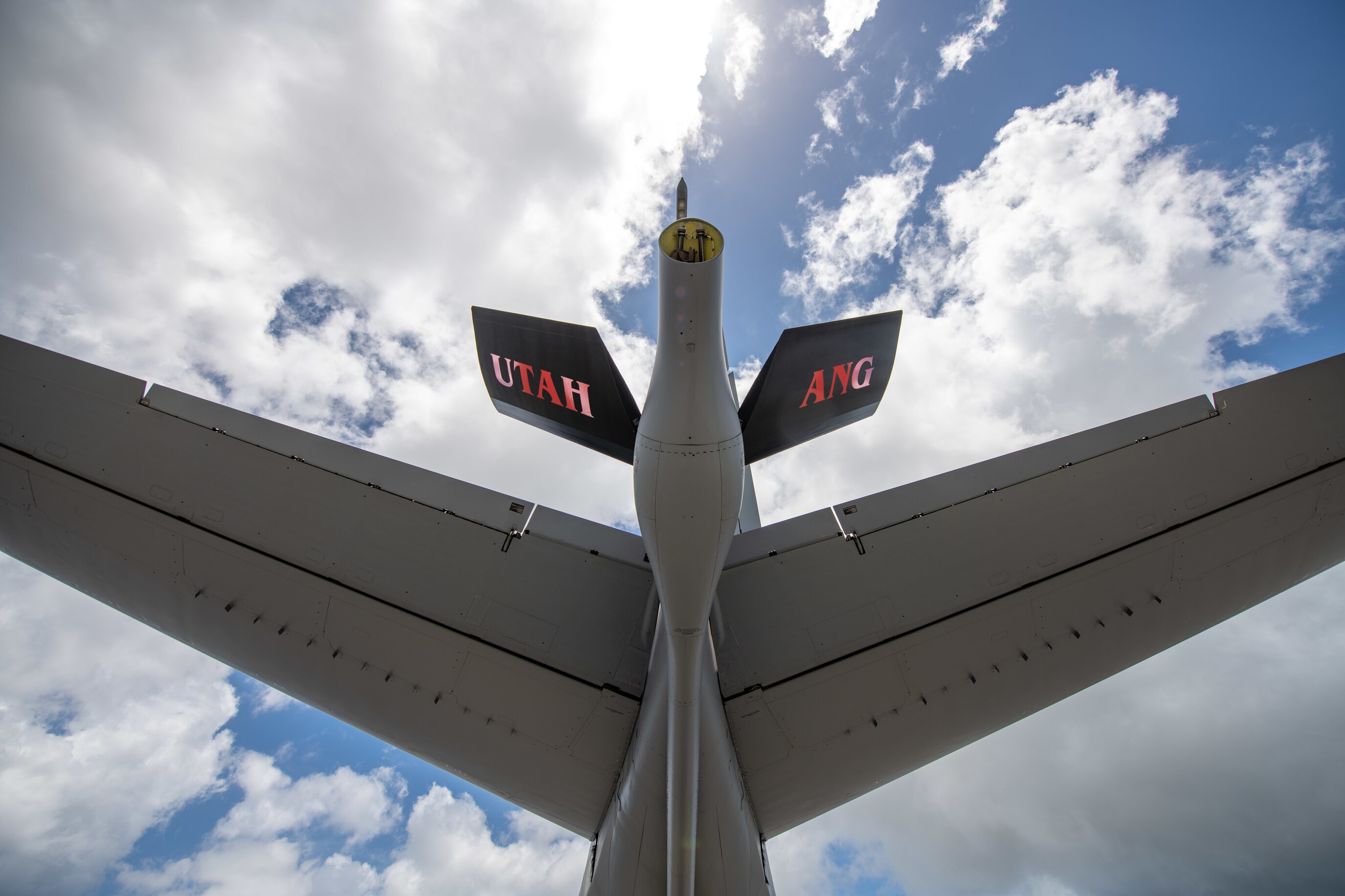 A KC-135 Stratotanker assigned to the 151st Air Refueling Wing is parked during exercise Northern Edge 23-2 at Kadena Air Base, Japan, July 11, 2023. The Real-time Information in the Cockpit system provides command and control capabilities to KC-135 crews by displaying enemy threats, target data and allied force locations on an avionics display located in the cockpit. (U.S. Air Force photo by Senior Airman Sebastian Romawac)