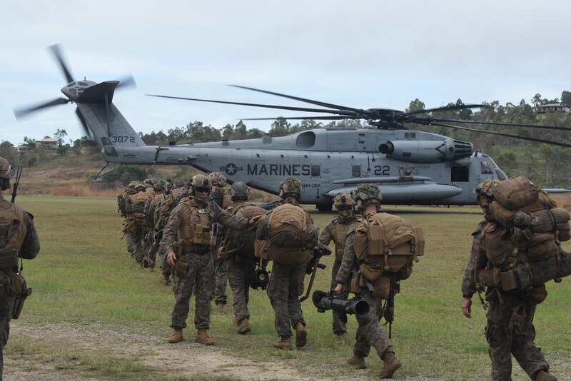 U.S. Marines participating in Exercise Talisman Sabre load onto a CH-53E Super Stallion helicopter in Queensland, Australia, July 28, 2023.