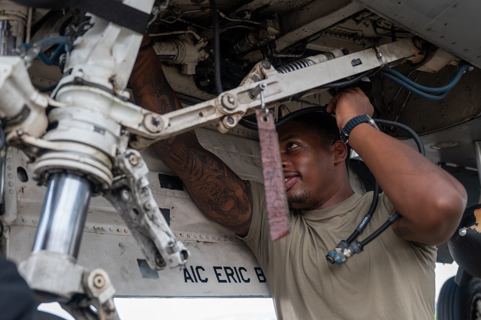 Staff Sgt. Mykelti Chatman, 35th Fighter Generation Squadron aircraft electrical environmental systems technician, inspects the landing equipment of an F-16 Fighting Falcon during a U.S.-Republic of Korea Buddy Squadron event at Cheongju Air Base, ROK, July 25, 2023. During the training event, the 35th FGS honed their agile combat employment techniques while ensuring all 35th Fighter Squadron aircraft were in top shape for bilateral training missions. (U.S. Air Force photo by Staff Sgt. Samuel Earick)