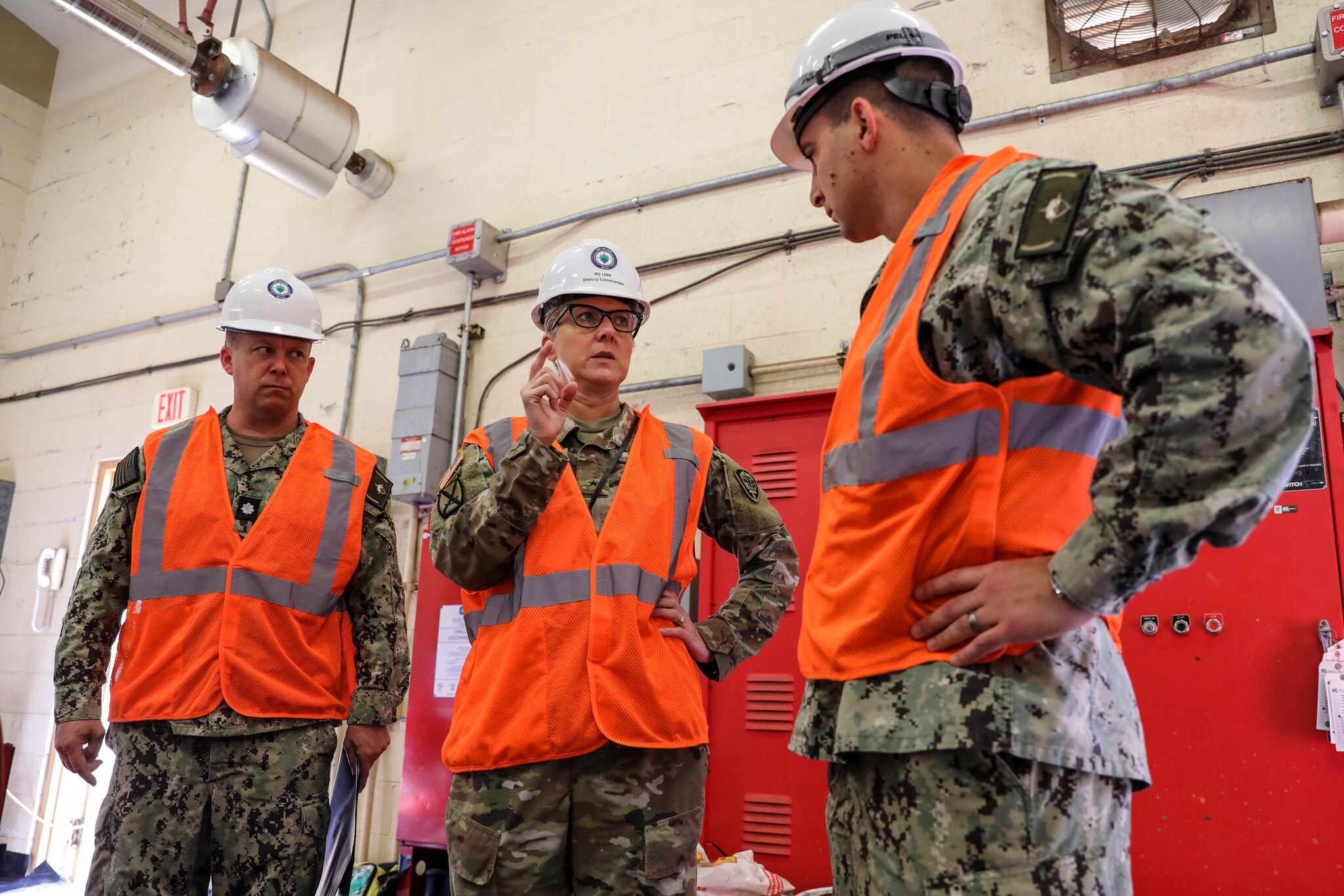 Joint Task Force-Red Hill (JTF-RH) Deputy Commander, U.S. Army Brig. Gen. Michelle Link (center), discusses preparations for water-based fire suppressant system testing at the Red Hill Bulk Fuel Storage Facility (RHBFSF) on Joint Base Pearl Harbor-Hickam, Hawaii, Aug. 2, 2023. JTF-RH is in phase three of its five-phase defueling plan. Personnel are focused on completing quality control tasks, training, response preparation, the National Environmental Policy Act Environmental Assessment, regulatory approvals and operational planning for all future major milestones. This extensive preparatory work will help ensure the safe and expeditious defueling of the RHBFSF. (DoD photo by U.S. Army Sgt. Kyler Chatman)