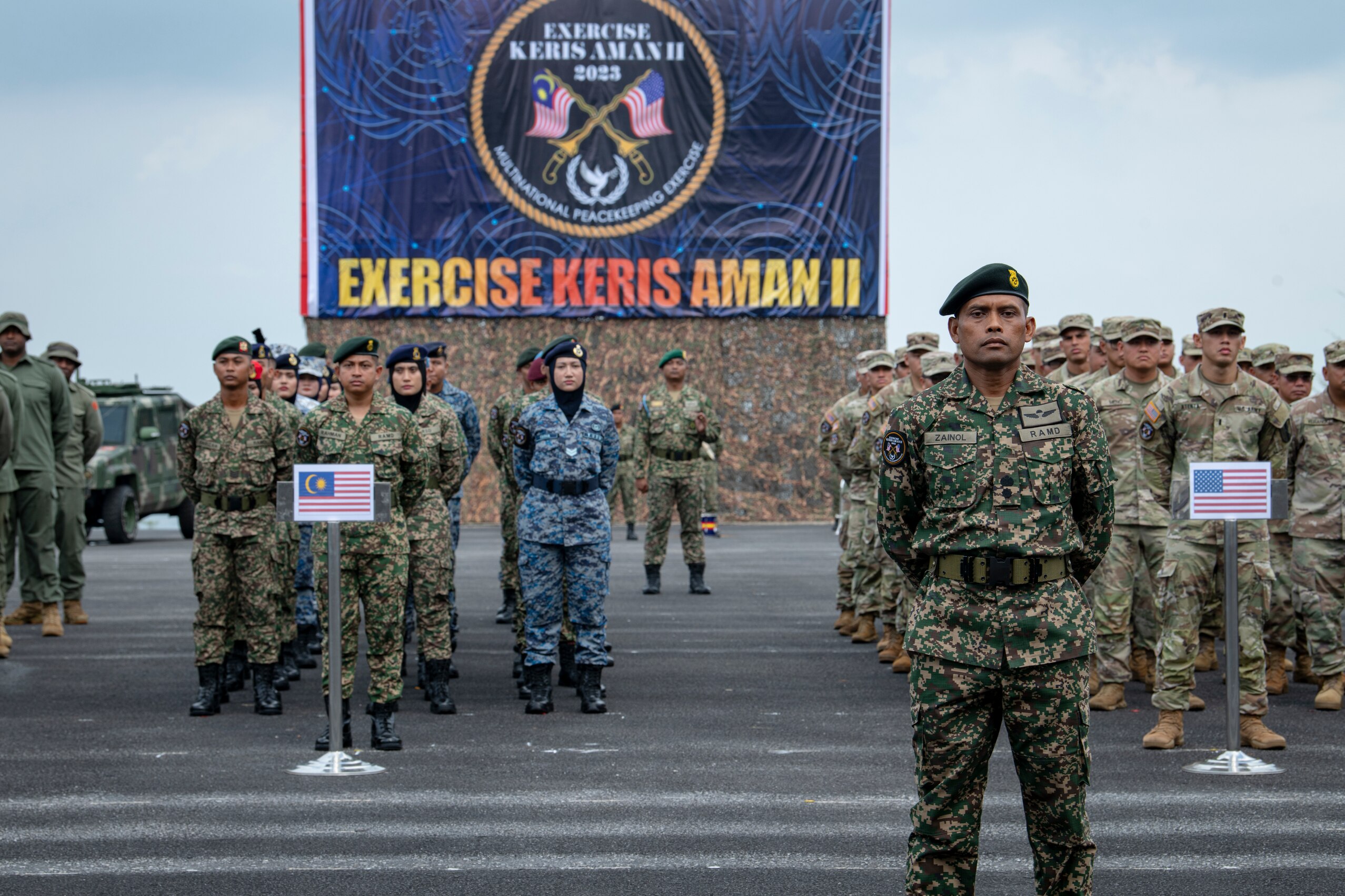 Combined service members from 19 countries participate in the opening ceremony of Exercise Keris Aman 23, a Multinational Peacekeeping Exercise, at the Malaysian Peacekeeping Centre on Aug. 13, 2023. . Keris Aman 2023 is a multinational United Nations Peacekeeping (UN PKO) exercise conducted in Malaysia and co-sponsored by U.S. Indo-Pacific Command and the Malaysian Armed Forces. The exercise is designed to strengthen military-to-military relationships and enhance the core PKO competencies of all participants in accordance with UN doctrine. (U.S. Marine Corps photo by Lance Cpl John Hall)