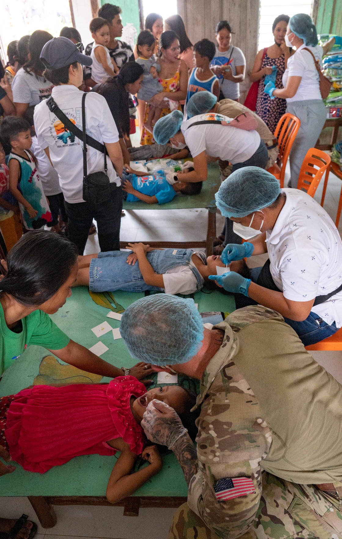 Naval Special Warfare operators apply fluoride to local children alongside Filipino medical professionals during a medical civic action program hosted by members of a U.S. Naval Special Warfare unit and U.S. Civil Affairs in Palawan, Philippines, July 30, 2023. Special Warfare is the nation’s elite maritime special operations force, uniquely positioned to extend the Fleet’s reach and gain and maintain access for the Joint Force in competition and conflict. (U.S. Navy Photo by Mass Communication Specialist 1st Class Daniel Gaither)