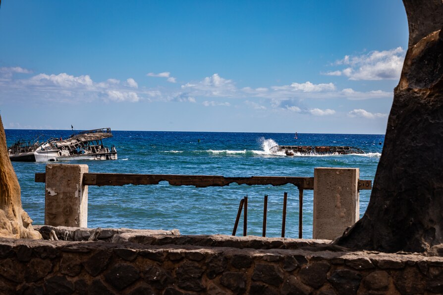 Damaged boats and watercraft sit off shore of Lahaina destroyed in the Maui wildfires in Lahaina, Maui, Hawaii, Aug. 15, 2023.