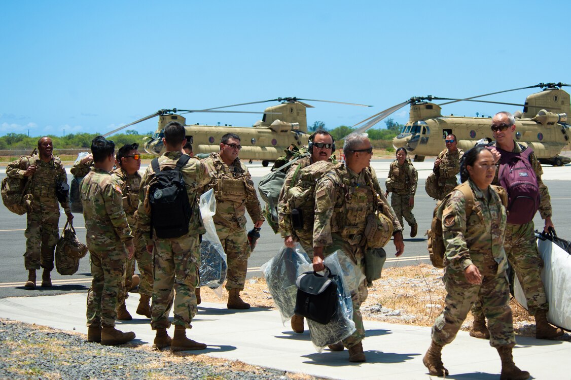 Hawaii National Guardsmen arrive at Kalaeloa Airport in Hawaii after supporting the town of Lahaina, which was devastated by the wildfires on Maui, Aug. 18, 2023.