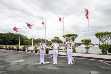 Japan Maritime Self-Defense Force Commander-in-Chief Self-Defense Fleet Vice Adm. SAITO Akira; Philippine Fleet Commander Rear Adm. Renato David; and Commander U.S. 7th Fleet Vice Admiral Karl Thomas pose for a photo in Manila, Philippines, Aug. 27. U.S. 7th Fleet is the U.S. Navy’s largest forward-deployed numbered fleet, and routinely interacts and operates with allies and partners to preserve a free and open Indo-Pacific.
