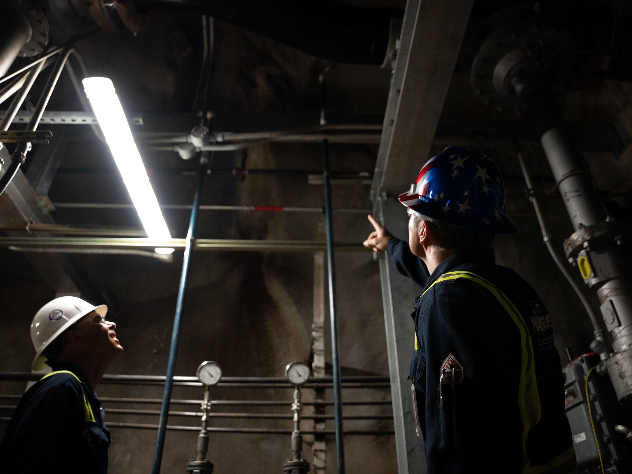 Joint Task Force-Red Hill (JTF-RH) Fuels Director, U.S. Navy Capt. Shawn Triggs, left, and Fleet Logistics Center Pearl Harbor Fuels Director, Cmdr. Joseph Bossi, right, inspect pipes during repacking operations at the Red Hill Bulk Fuel Storage Facility (RHBFSF), Halawa, Hawaii, Sept. 5, 2023. Repacking is necessary to remove all air from the pipelines and ensure a stable flow of fuel when defueling the main underground storage tanks. Repacking is a preparatory step prior to defueling.(DoD photo by Cpl. Gabrielle Zagorski)