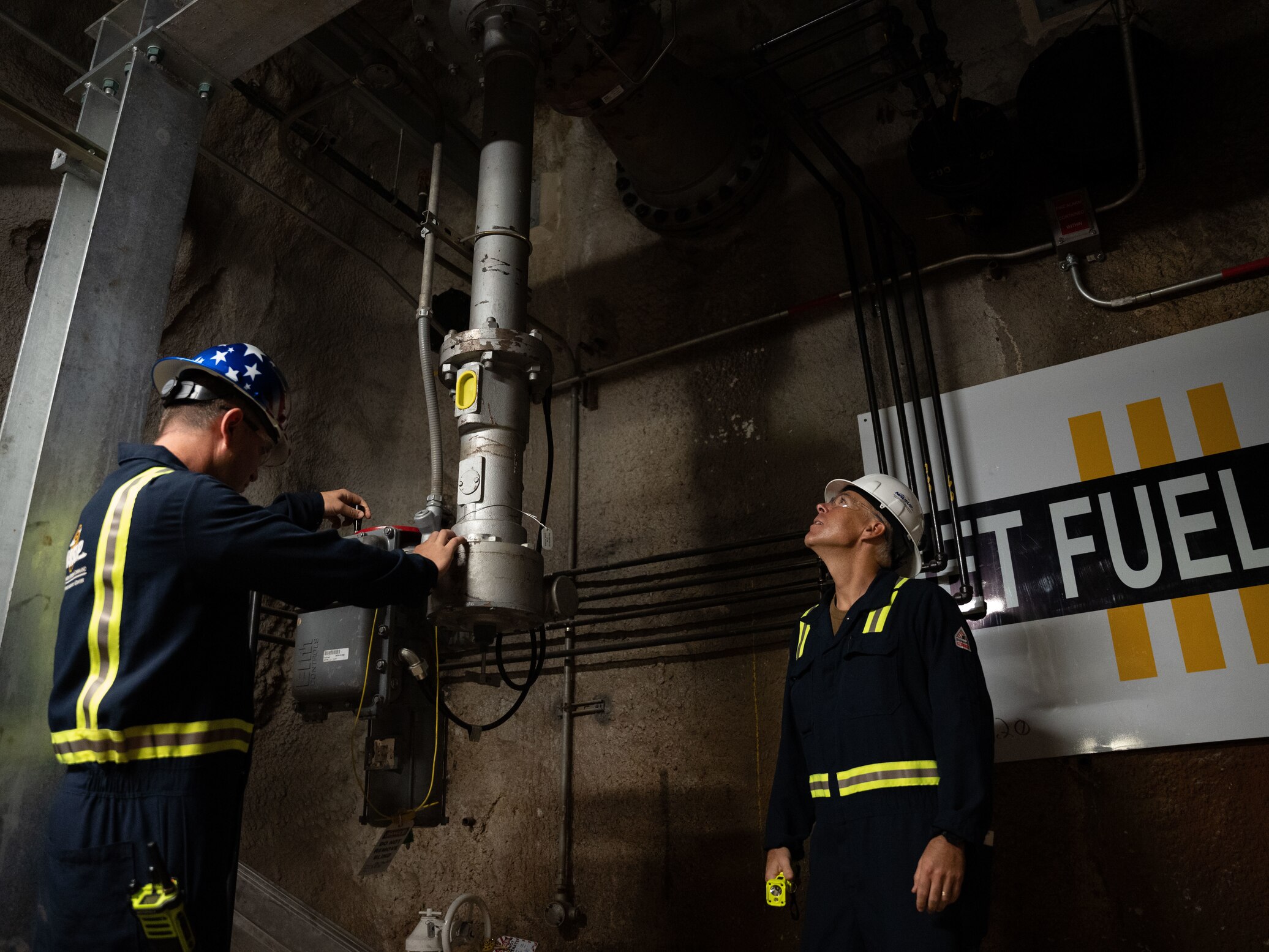 Joint Task Force-Red Hill (JTF-RH) Fuels Director, U.S. Navy Capt. Shawn Triggs, right, and Fleet Logistics Center Pearl Harbor Fuels Director, Cmdr. Joseph Bossi, left, inspect fuel gauges and pipes during repacking operations at the Red Hill Bulk Fuel Storage Facility (RHBFSF), Halawa, Hawaii, Sept. 5, 2023. Repacking is necessary to remove all air from the pipelines and ensure a stable flow of fuel when defueling the main underground storage tanks. Repacking is a preparatory step prior to defueling. (DoD photo by Cpl. Gabrielle Zagorski)