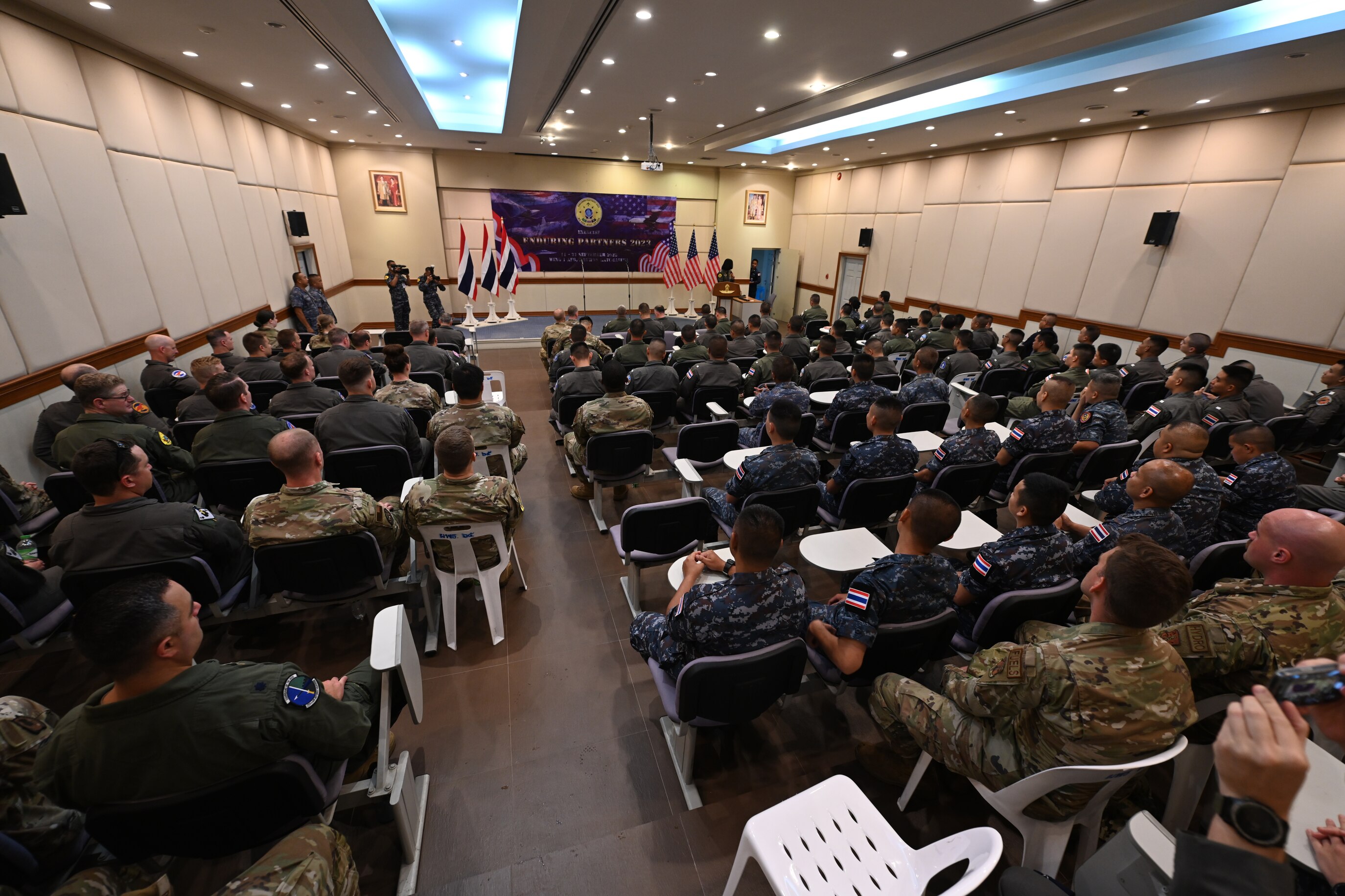 Airmen from the United States and Royal Kingdom of Thailand prepare for the opening ceremony of Enduring Partners 2023, Korat Air Base, Kingdom of Thailand, September 11, 2023. The exercise is a joint exercise between the Kingdom of Thailand, the Washington and Oregon Air National Guard. The Washington National Guard has a long-standing State Partnership with the Kingdom of Thailand. (U.S. Air Force photo by Tech. Sgt. Michael L. Brown)