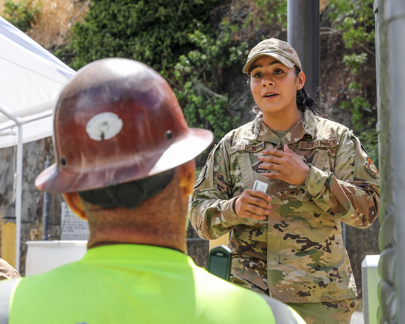 Joint Task Force-Red Hill (JTF-RH) Access Control Point (ACP) team member, U.S. Air National Guard Senior Airman Maritza Garcia, provide assistance to JTF-RH civilian at the Red Hill Bulk Fuel Storage Facility (RHBFSF) ACP, Halawa, Hawaii, Sept. 12, 2023. JTF-RH is in phase four of its five-phase defueling plan where personnel are focused on completion of pre-defueling material assessments, continued training and rehearsals, routine maintenance actions, and quality assurance and safety checks. This is the final preparatory stage prior to commencement of gravity defueling on October 16 and marks the final coordination with the Department of Defense, Environmental Protection Agency, and Hawaii Department of Health before approval to defuel is received. (DoD photo by U.S. Army Sgt. Kyler L. Chatman)