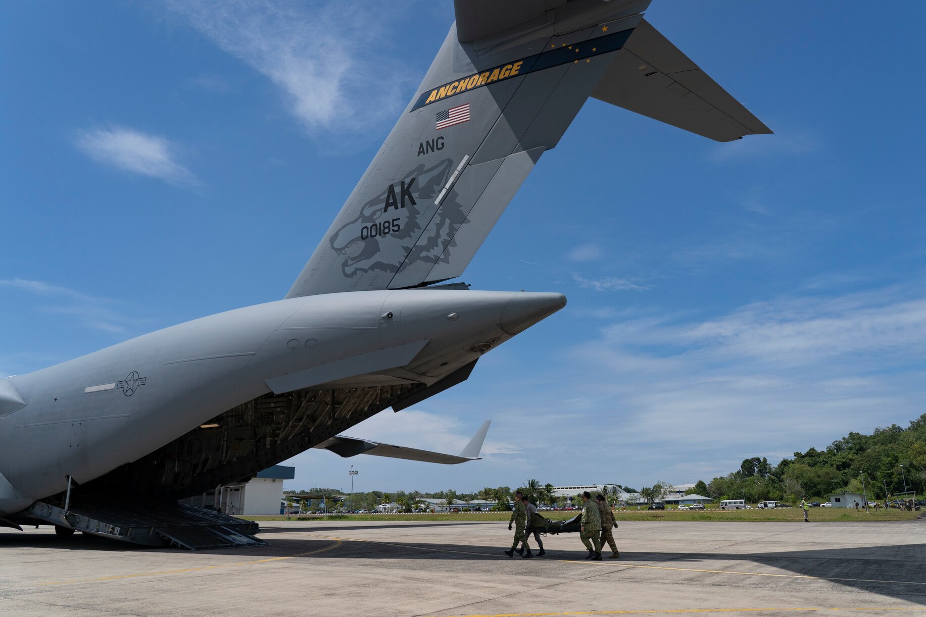 U.S. Air Force Capt. Sara Hidinger, flight nurse assigned to the 18th Operations Group at Kadena Air Base, Japan, and members of the Royal Brunei Air Force Medical Service transport patients to a C-17 Globemaster III assigned to the 176th Wing, Alaska Air National Guard during exercise Pacific Angel 23-3, Rimba Air Force Base, Brunei, Sept. 14, 2023. Pac-Angel 23-3 is a joint and combined regional humanitarian assistance and disaster relief engagement led by Pacific Air Forces at the Rimba AFB in Bandar Seri Begawan, Brunei. This iteration of Pacific Angel is focused on regional search and rescue (SAR) and Humanitarian Assistance/Disaster Response (HA/DR) capacity-building interoperability with partnering nations. (U.S. Air Force photo by Airman 1st Class Shelimar Rivera Rosado)