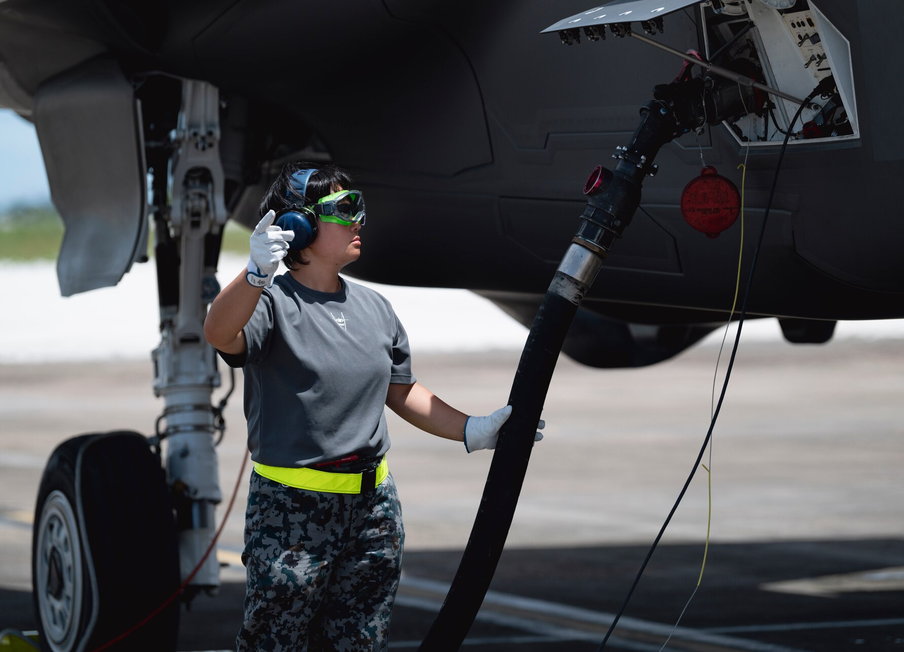A Japan Air Self-Defense Force member refuels a F-35A Lightning II during a hot-pit refuel on Andersen Air Force Base, Guam, Aug. 28, 2023. These operations project that our regional coalition partners are evolving tactics and capabilities in order to maintain peace through deterrence. (U.S. Air Force photo by Airman 1st Class Lauren Clevenger)