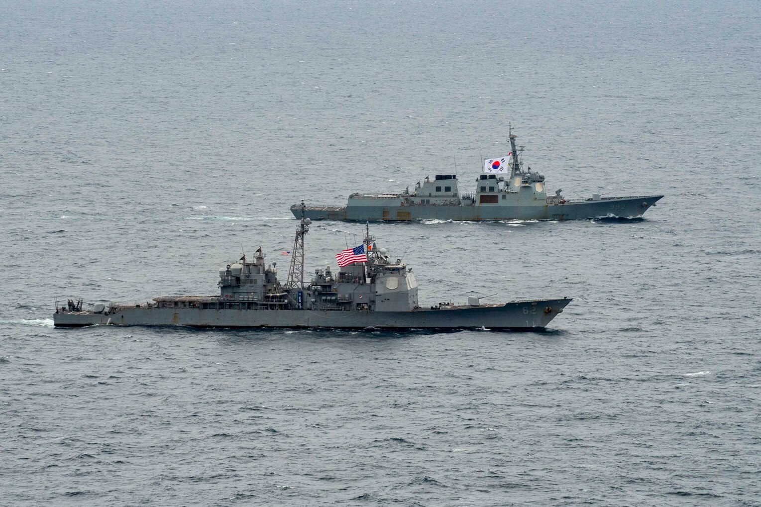 AT SEA (Sept. 25, 2023) The Ticonderoga-class guided-missile cruiser USS Robert Smalls (CG 62) operates in formation with the Republic of Korea Navy Sejong the Great-class guided-missile destroyer ROKS Yulgok Yi I (DDG 992) during a bilateral exercise, Sept. 25. Robert Smalls is assigned to Commander, Task Force 70 and is participating in a multi-domain bilateral exercise with the Republic of Korea Navy in the U.S. 7th Fleet area of operations. The exercise is taking place near the 70th anniversary of the U.S. and Republic of Korea’s Oct. 1, 1953 Mutual Defense Treaty. [U.S. Navy photo by Naval Air Crewman (Helicopter) 2nd Class Timothy Fortin]
