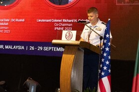 Lt. Col. Richard Caballero, U.S. Indo-Pacific Command co-chair for the Indo-Pacific Military Health Exchange, welcomes personnel to the medical exchange on the first day in Kuala Lumpur, Malaysia. The IPMHE is a multilateral military event focused on partnership and interoperability and co-hosted by the armed forces of a country in the Indo-Pacific region together with the United States Indo-Pacific Command Surgeon. (U.S. Army photo by SFC Timothy Hughes)