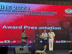 Lt. Gen. Dato’ Dr Zulkeffeli bin Mat Jusoh, Director General of the Malaysian Armed Forces Health Services, awards U.S. Air Force Maj. Lisa Paulson, 374 medical group at Yokota Air Base, Japan, for her poster presentation on “Efficacy of VTE Prophylaxis in Trauma Patients with Elevated BMI” at the Indo-Pacific Military Health Exchange, or IPMHE, in Kuala Lumpur, Malaysia. The IPMHE is a multilateral military event focused on partnership and interoperability and co-hosted by the armed forces of a country in the Indo-Pacific region together with the United States Indo-Pacific Command Surgeon. (U.S. Air Force photo by Lt. Col. Richard Trowbridge)