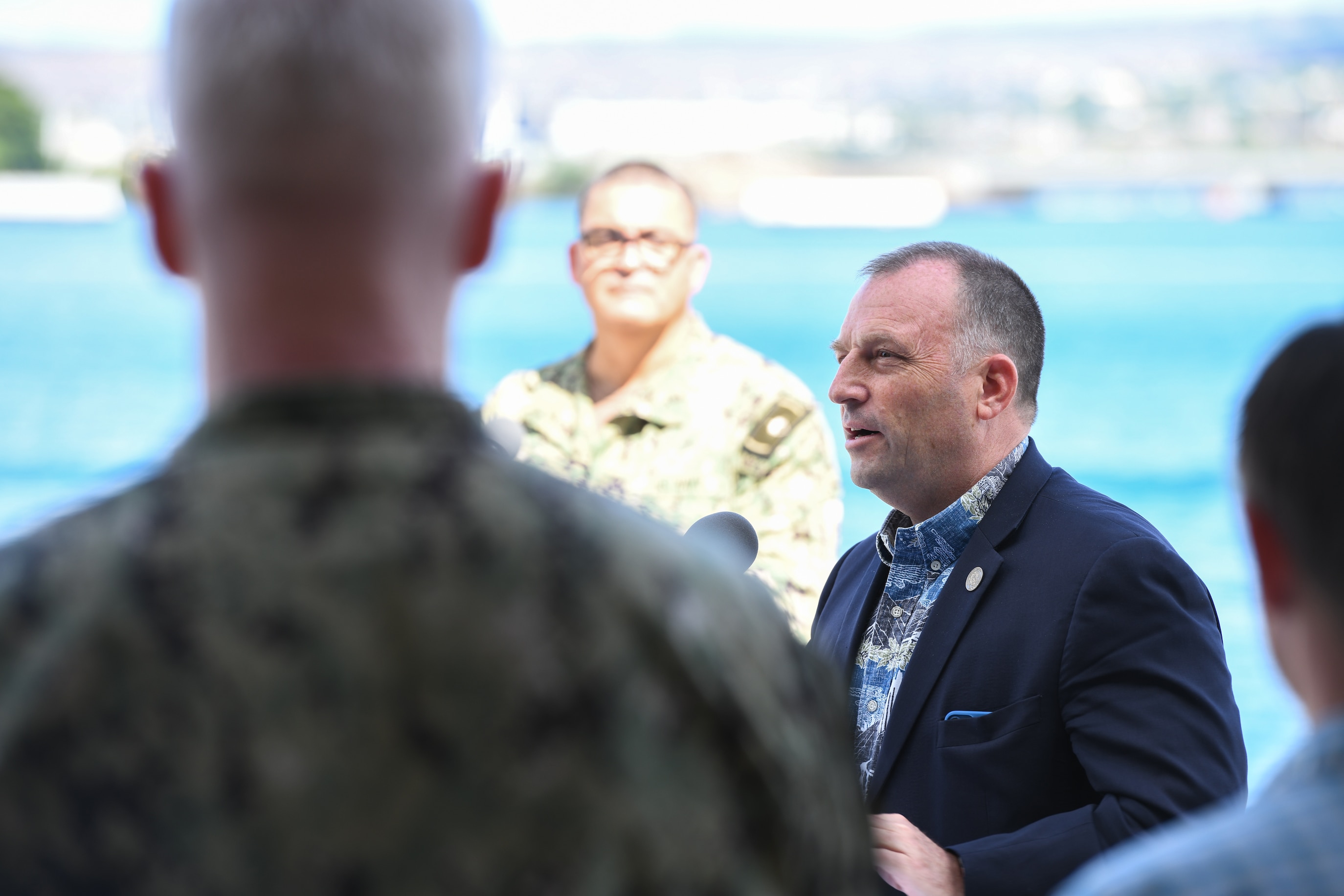 Hawaii State Gov. Josh Green delivers remarks during a press conference held Oct. 13 hosted by Joint Task Force - Red Hill (JTF-RH). The press conference announced JTF-RH’s intent to defuel the Red Hill Bulk Fuel Storage Facility commencing Oct. 16, 2023, at Joint Base Pearl Harbor-Hickam, Hawaii. (DoD photo by U.S. Air Force Tech. Sgt. John Linzmeier)