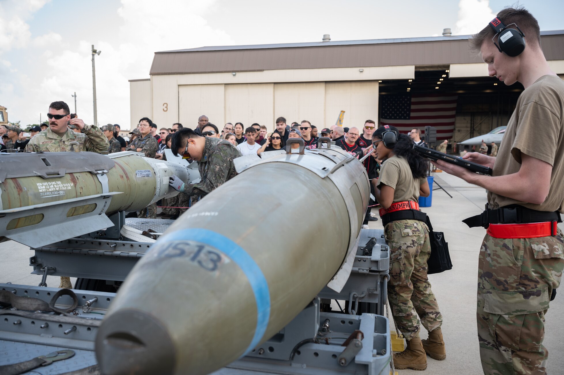 Republic of Korea Air Force 38th Fighter Group and U.S. Air Force 36th Fighter Generation Squadron load crew members prepare their respective munitions during Pen Fest, the annual bilateral munitions load crew competition at Kunsan Air Base, ROK, Oct. 14, 2023. During the competition, five teams competed in an event that tested their speed and accuracy when loading three different munitions onto their respective aircraft. (U.S. Air Force photo by Tech. Sgt. Emili Koonce)
