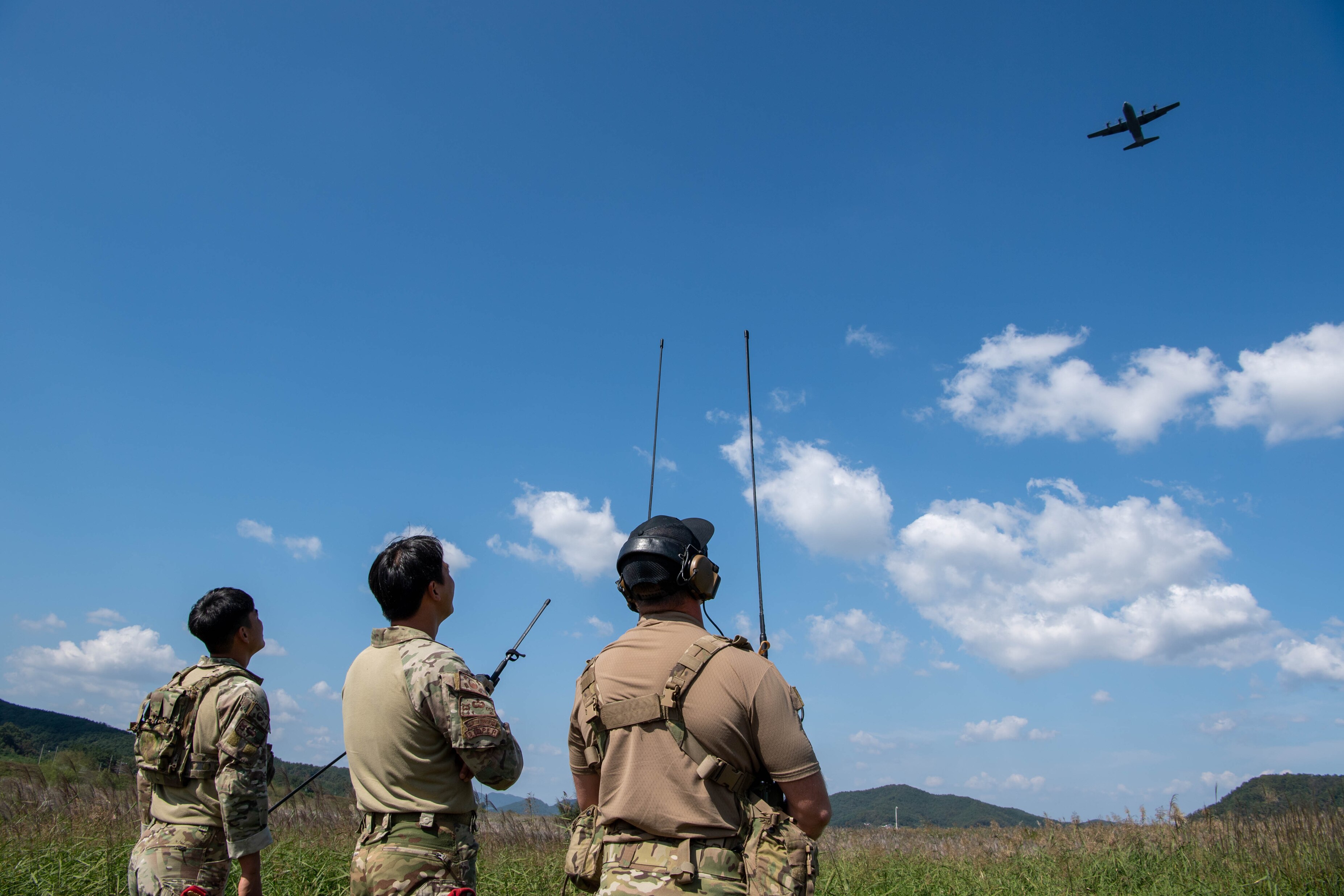 A combat controller, right, assigned to the 353rd Special Operations Wing, watches a C-130J Super Hercules fly overhead alongside Republic of Korea Air Force members during Herk Guardians 23 at a training drop zone in South Korea, Oct. 11, 2023. Combat controllers are trained in a wide range of skills and are certified to act as air traffic controllers to support missions all over the world. (U.S. Air Force photo by Airman 1st Class Natalie Doan)