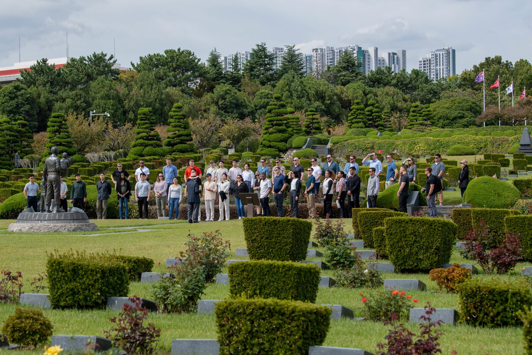 Airmen from the U.S. Air Force and Republic of Korea Air Force participate in a tour at the United Nations Memorial Cemetery in Busan, South Korea, Oct. 13, 2023. The tour was part of a cultural exchange between members of both militaries. (U.S. Air Force photo by Airman 1st Class Natalie Doan)