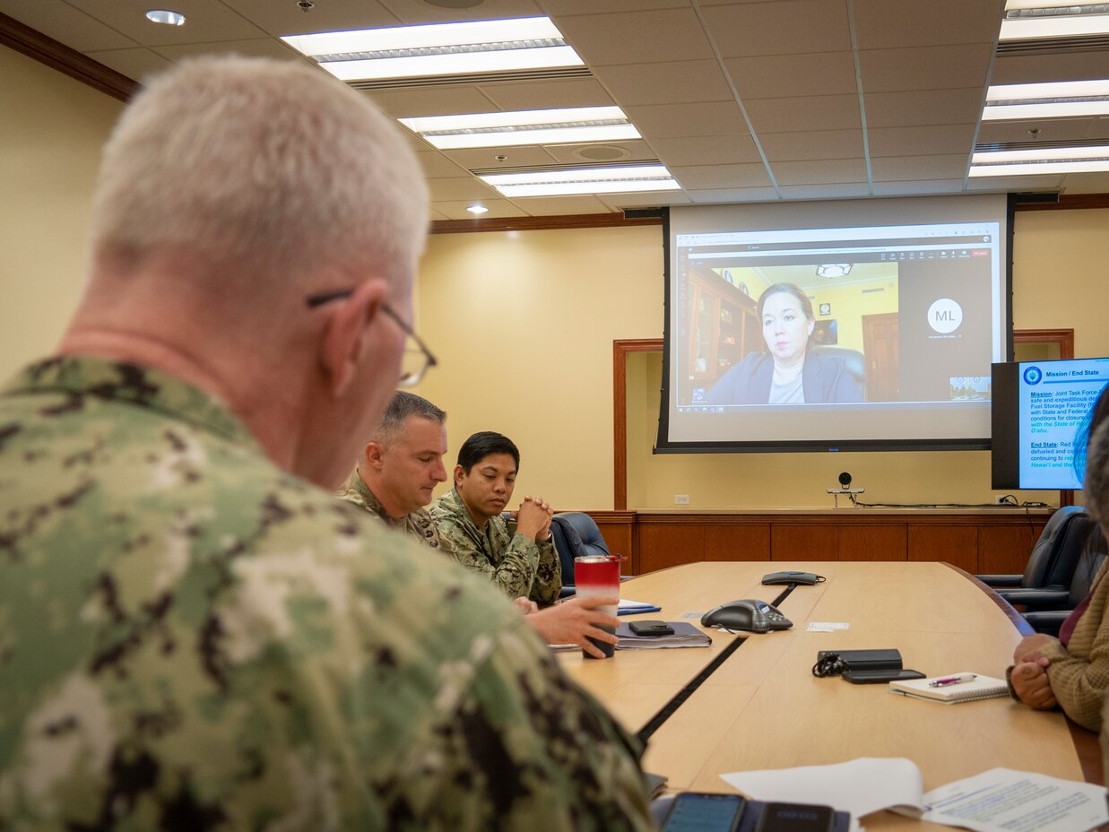 Joint Task Force-Red Hill (JTF-RH) Commander, U.S. Navy Vice Adm. John Wade updates U.S. Rep. Jill Tokuda on the status of Red Hill Bulk Fuel Storage Facility (RHBFSF) defueling operations at Joint Base Pearl Harbor-Hickam, Hawaii, Oct. 19, 2023. JTF-RH is in the fifth and final phase of its defueling plan, where JTF-RH along with Defense Logistics Agency Energy and Fleet Logistics Center Pearl Harbor, are safely gravity defueling the RHBFSF. This stage consists of defueling approximately 104 million gallons of fuel, with planned strategic pauses for safety checks, and transporting the fuel to various locations throughout the Pacific. JTF-RH continues to work in collaboration with state and federal regulators to ensure proper oversight throughout the defueling process. (DoD photo by U.S. Air Force Staff Sgt. Orlando Corpuz)