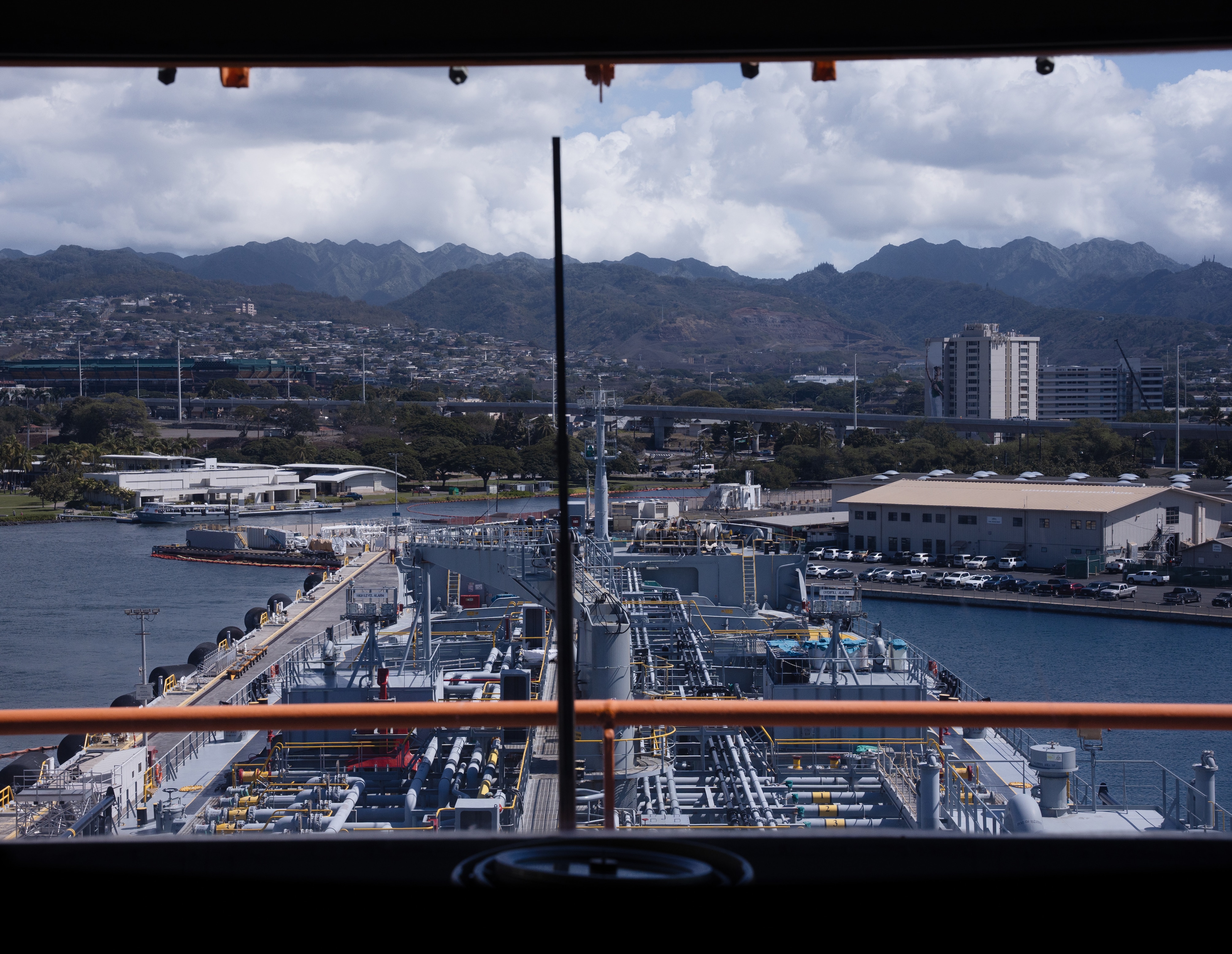 The view from merchant tanker Torm Thunder bridge as it awaits the third transfer of fuel from the Red Hill Bulk Fuel Storage Facility (RHBFSF) at Joint Base Pearl Harbor-Hickam Oct. 25, 2023. Joint Task Force-Red Hill (JTF-RH) is in the fifth and final phase of its defueling plan, where JTF-RH along with Defense Logistics Agency Energy and Fleet Logistics Center Pearl Harbor are safely Defueling the RHBFSF. This stage consists of defueling approximately 104 million gallons of fuel, with planned strategic pauses for safety checks, and transporting the fuel to various locations throughout the Pacific. JTF-RH continues to work in collaboration with state and federal regulators to ensure proper oversight throughout the defueling process. (DoD photo by U.S. Army Spc. Johanna Dieckman)