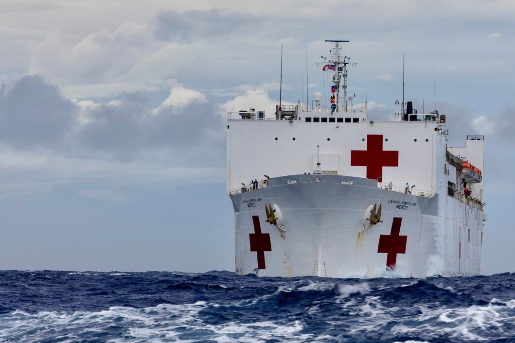 The hospital ship USNS Mercy (T-AH 19) prepares to anchor off the coast of Majuro, Republic of Marshall Islands, prior to its first mission stop for Pacific Partnership 2024-1 Oct. 30, 2023. Pacific Partnership, now in its 19th iteration, is the largest multinational humanitarian assistance and disaster relief mission in the Pacific and brings together more than 1000 participants from 8 partner and host nations. (U.S. Navy photo by Grady Fontana)