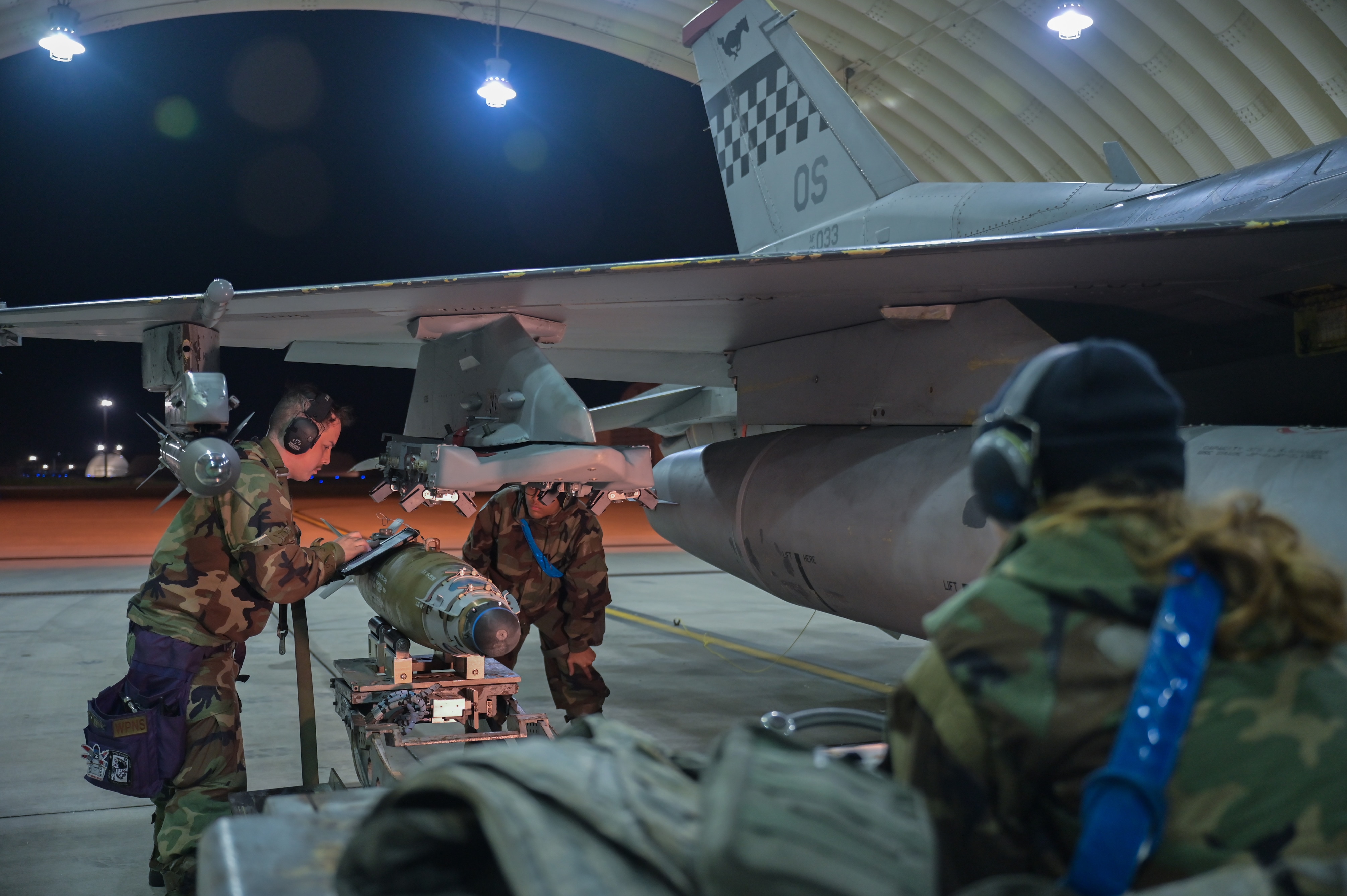 Staff Sgt. Ashton Alamo, 35th Fighter Generation Squadron weapons load crew member, reads the technical order before securing a munition to a U.S. Air Force F-16 Fighting Falcon during Vigilant Defense 24 at Kunsan Air Base, Republic of Korea, Nov. 2, 2023. Combined Flying Training Events integrate U.S. and ROK forces to train on mutual support procedures, further improving understanding and trust between the two nations. (U.S. Air Force photo by Tech. Sgt. Emili Koonce)